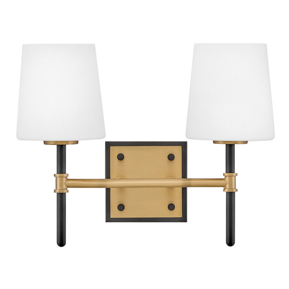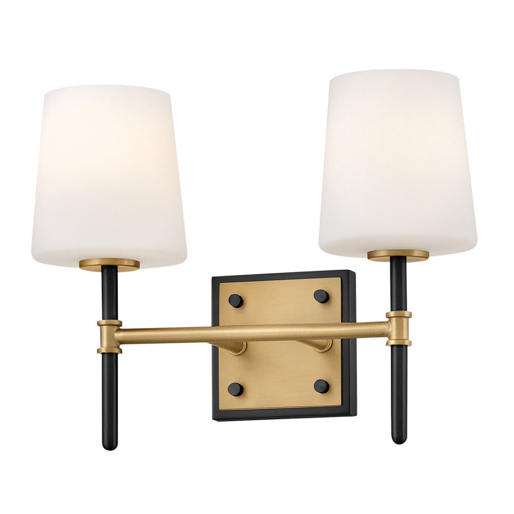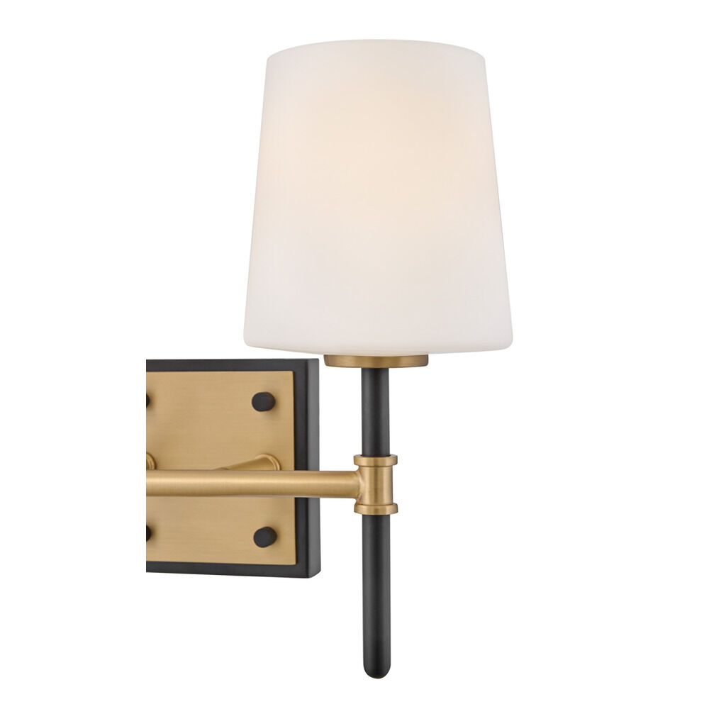 Transitional black & lacquered brass 2-light bathroom light with hand blown,etched etched opal glass shade