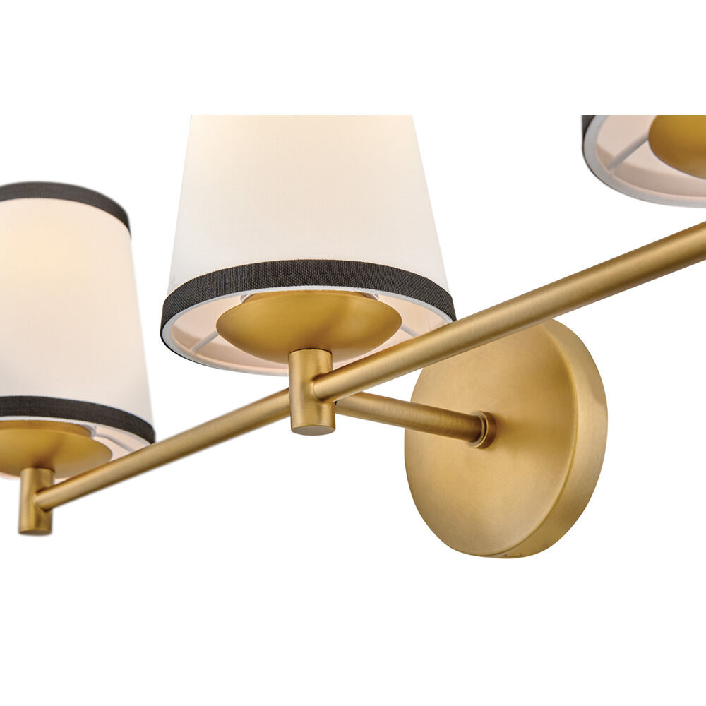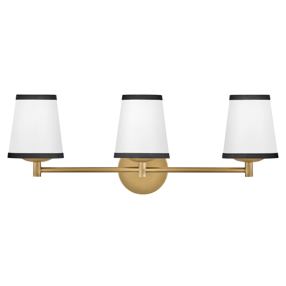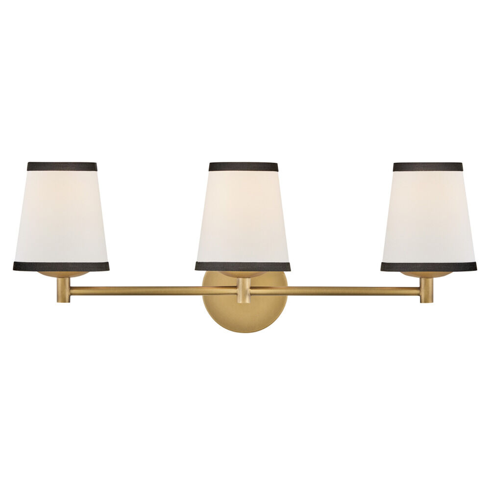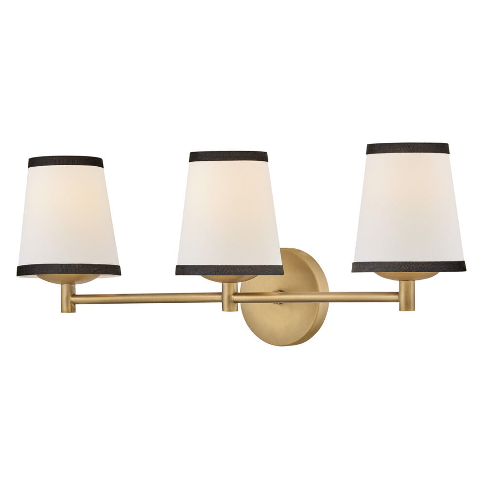 Transitional lacquered brass 3-light bathroom light with off-white linen shade