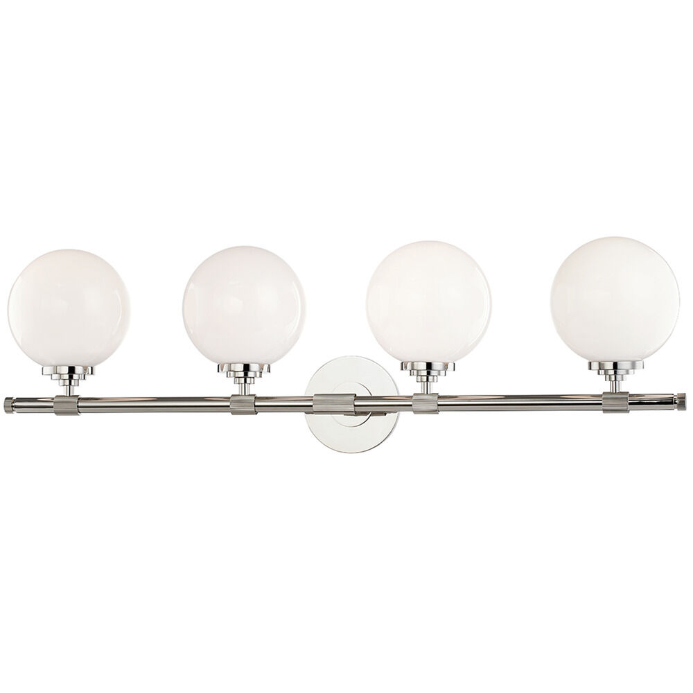 Hudson Valley Lighting 3704-PN four-light vanity fixture with polished nickel finish features clear seeded glass shades for warm ambient lighting-ideal for bathrooms and powder rooms-easy to install and complements modern farmhouse and transitional interiors