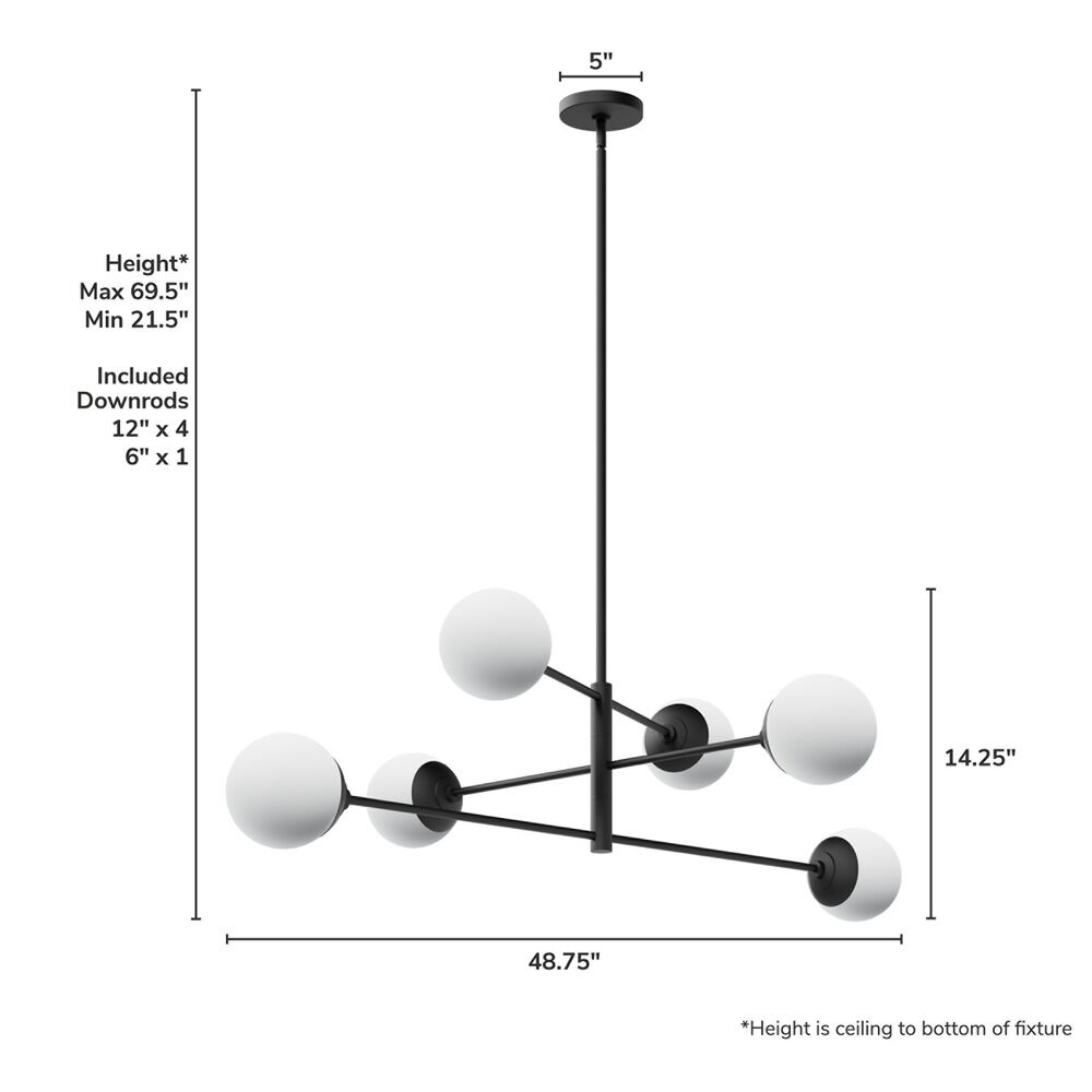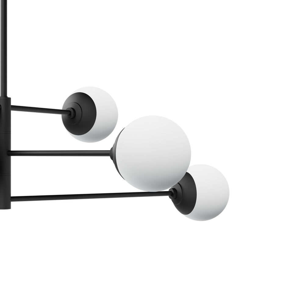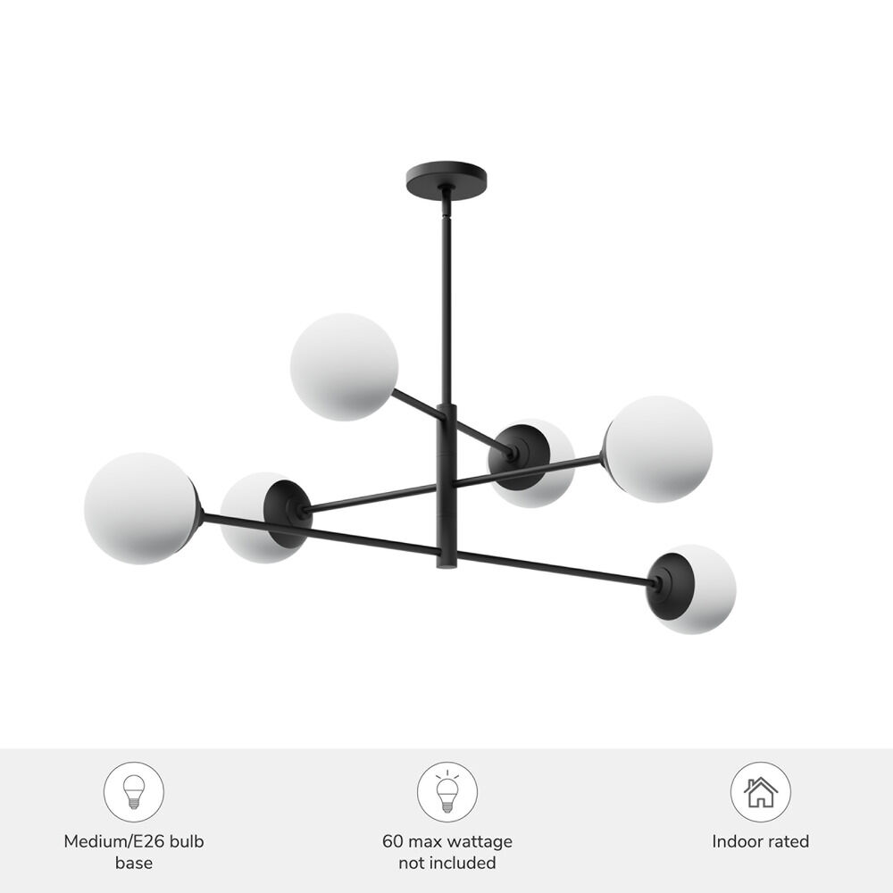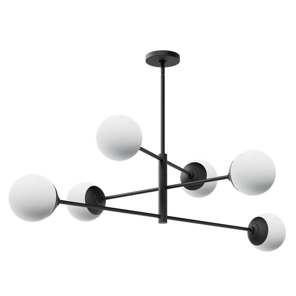 Mid-century modern matte black 6-light chandelier with cased white glass shade