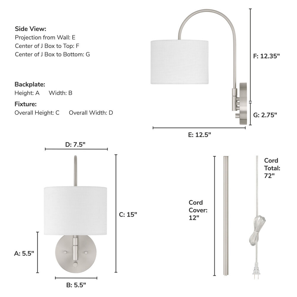 The following are detailed specifications about the Hunter Fan Company Horizon Brushed Nickel LED Plug and Cord Wall Lamp.
