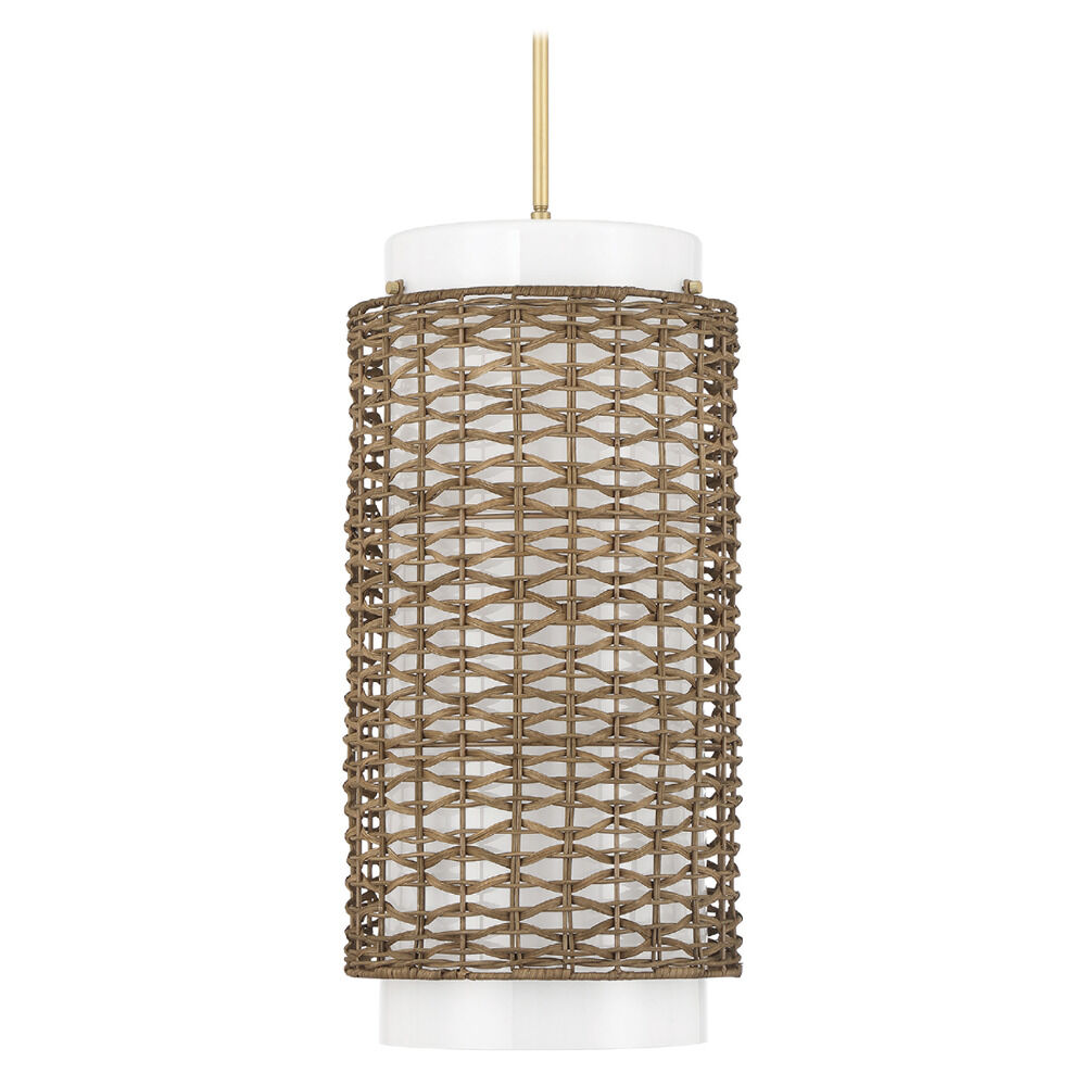 Organic luxe gold 3-light pendant light with cased white glass,rattan shade