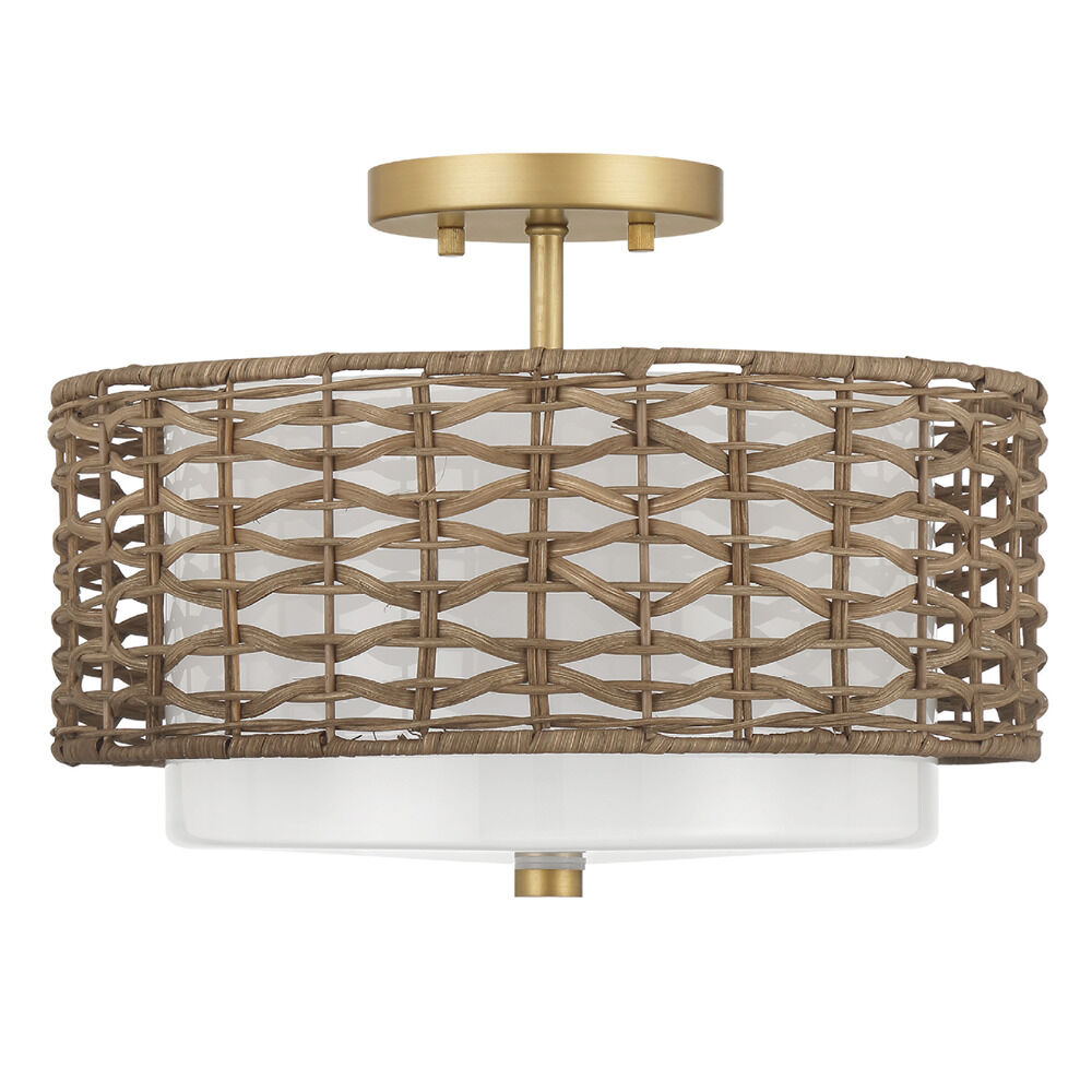 Organic luxe gold 2-light indoor ceiling light with cased white glass,rattan shade
