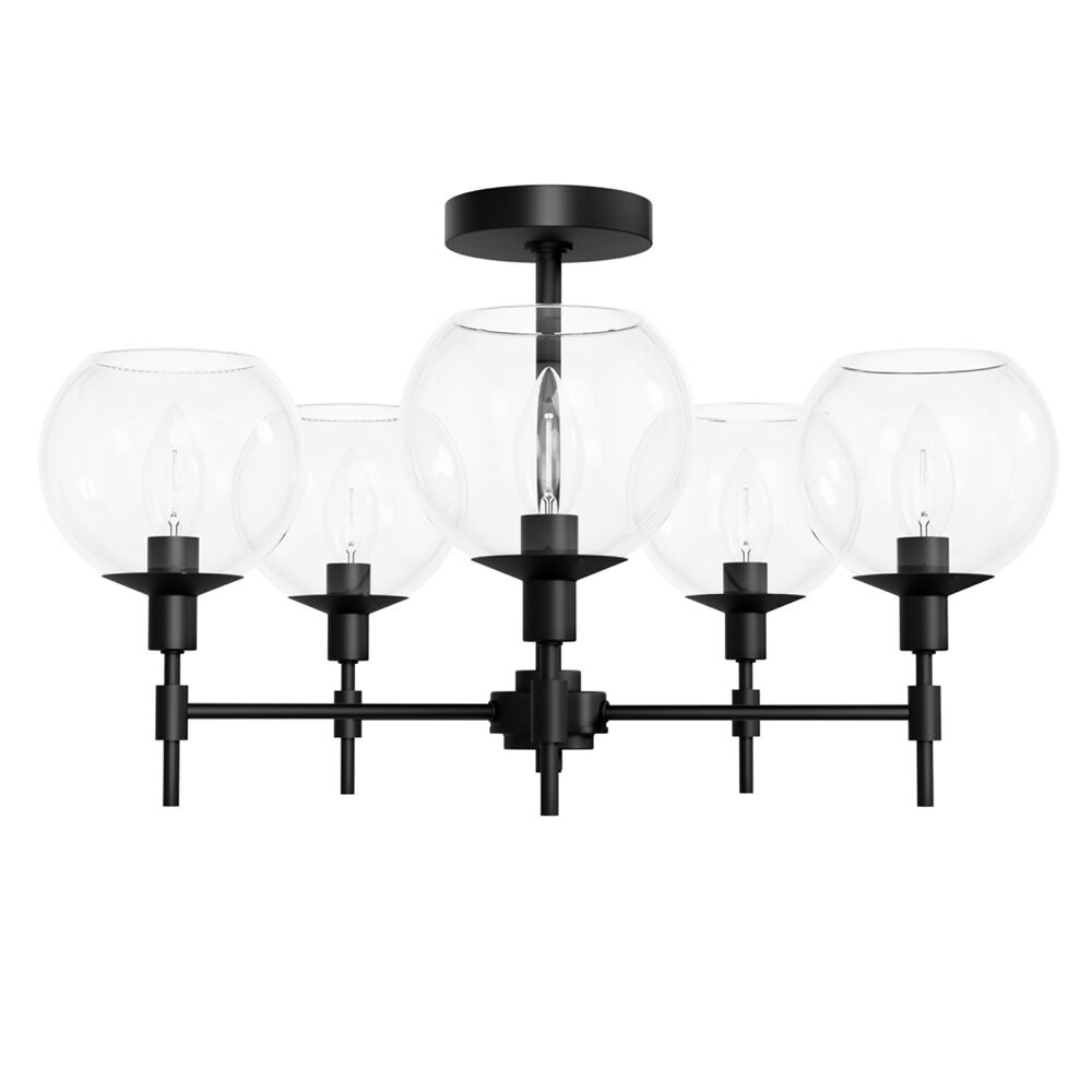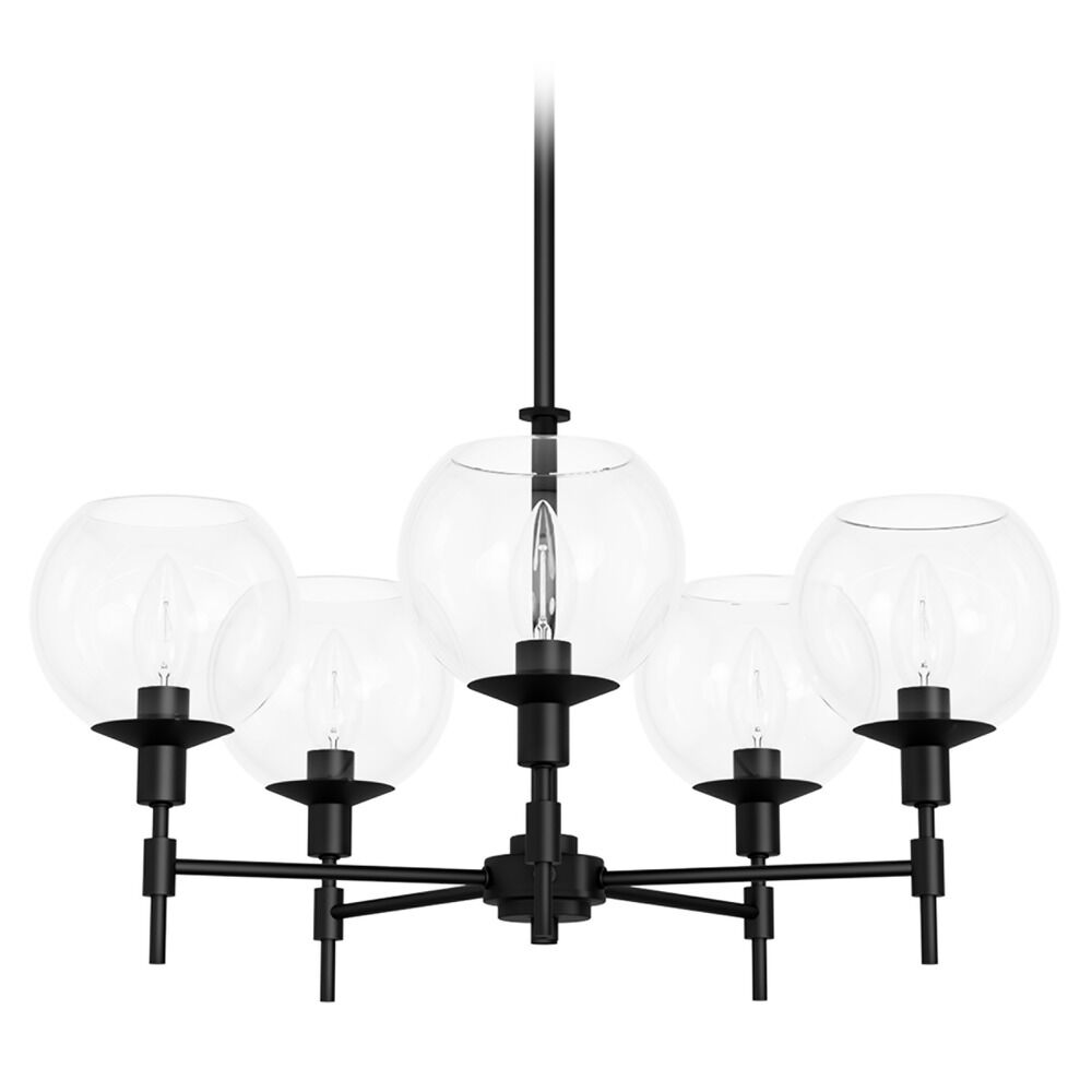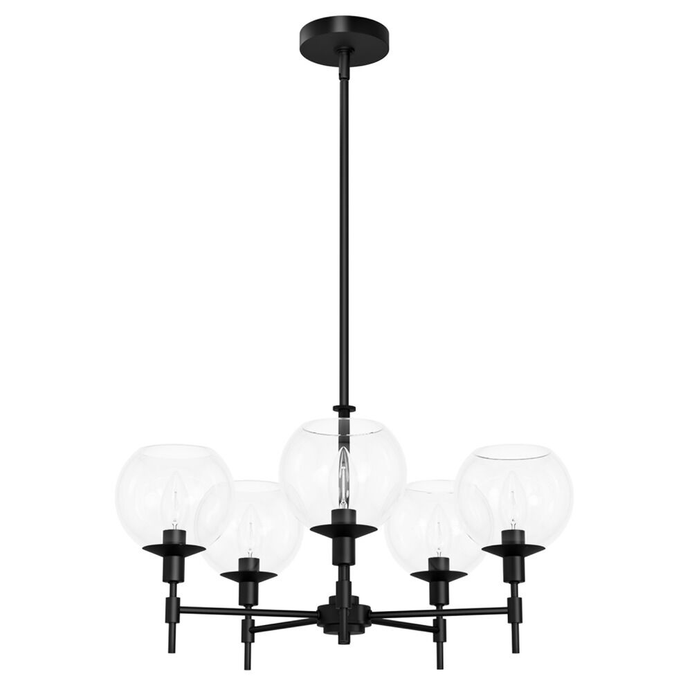 Mid-century modern matte black 5-light chandelier with clear glass shade