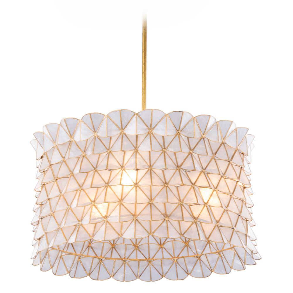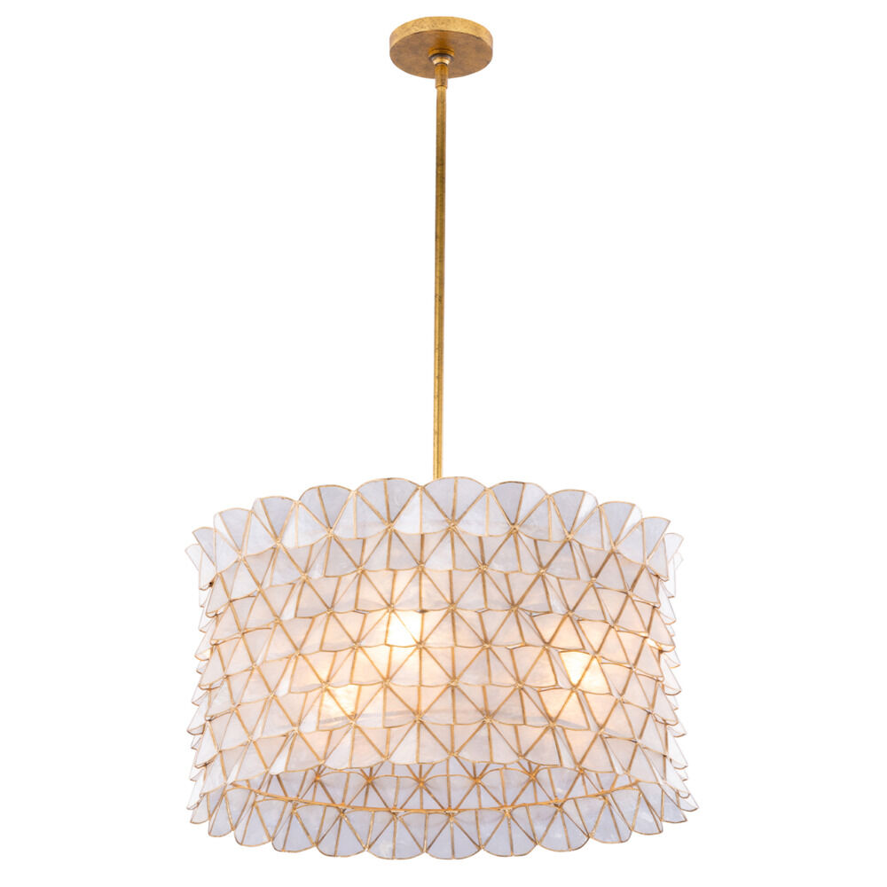 Inspired by the softness of scalloped edges and geometric patterns. The Flair collection is made from natural Capiz shell material and a gold leaf finish. The concave handcrafted pattern allows for a 3D light effect.