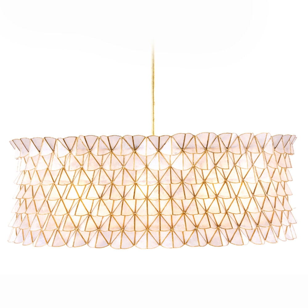 Inspired by the softness of scalloped edges and geometric patterns. The Flair collection is made from natural Capiz shell material and a gold leaf finish. The concave handcrafted pattern allows for a 3D light effect.
