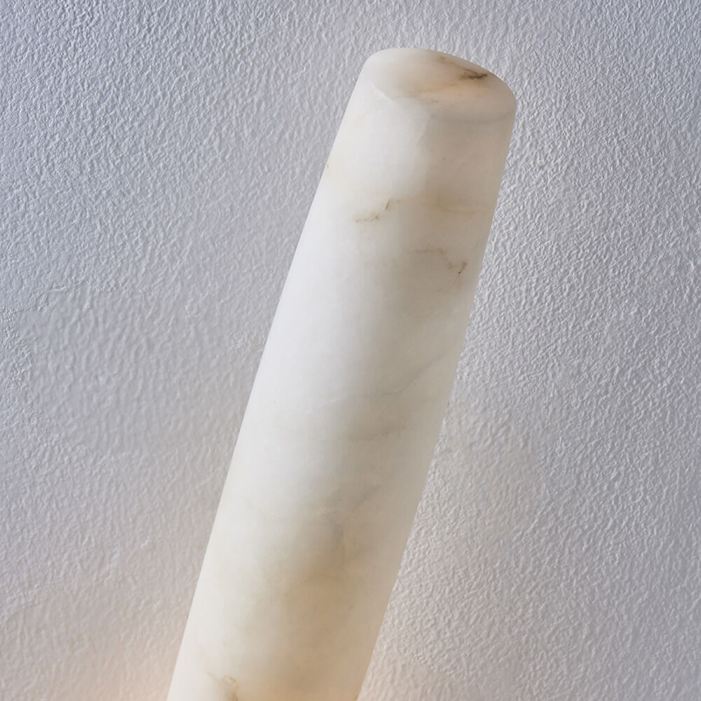 Botanically inspired by Pinecone shapes, the soft Art Deco design of the Gypsum wall sconce features a cylindrical slightly bulged natural Alabaster stone cylinder that diffuses the LED light and gives the fixture a softer luxurious look. Offered in True Brass with driverless LED technology.