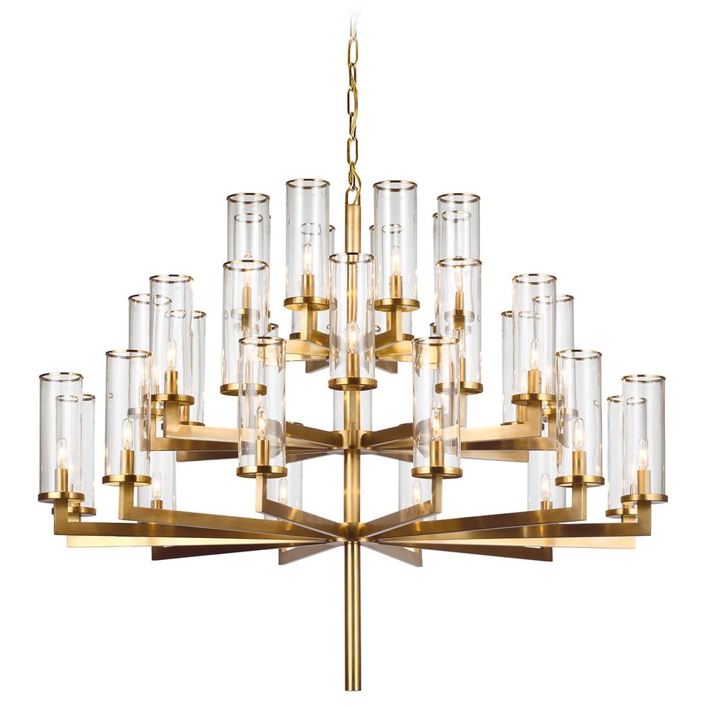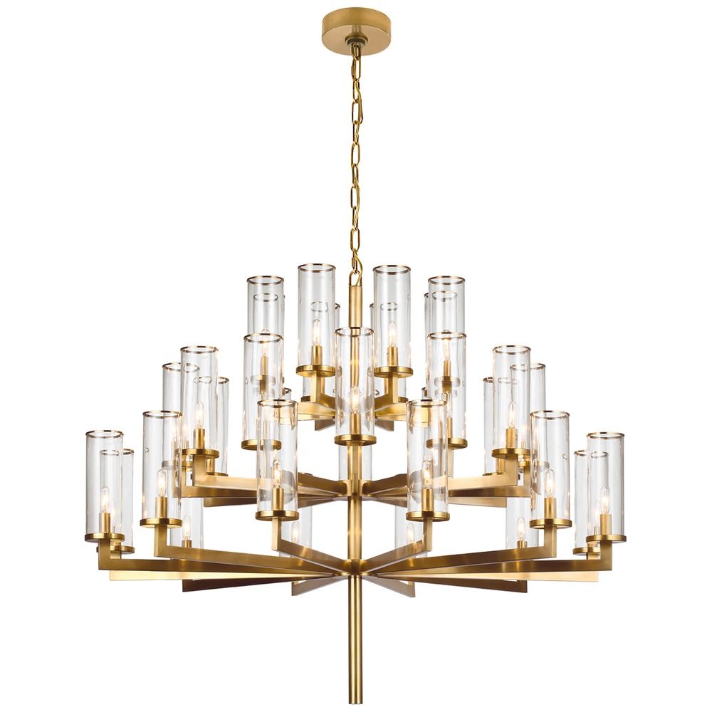 Update your dining room or entry with Kelly Wearstler's Liaison Triple Tier Chandelier by Visual Comfort. The Liaison features an overall rounded shape, simple yet sophisticated. This fixture has cylindrical clear glass, as well as an Antique-Burnished Brass finish. The Liaison requires thirty-two 40W maximum candelabra base C11 light bulbs. Clear or vintage bulbs are recommended. This fixture is rated for Damp Location.