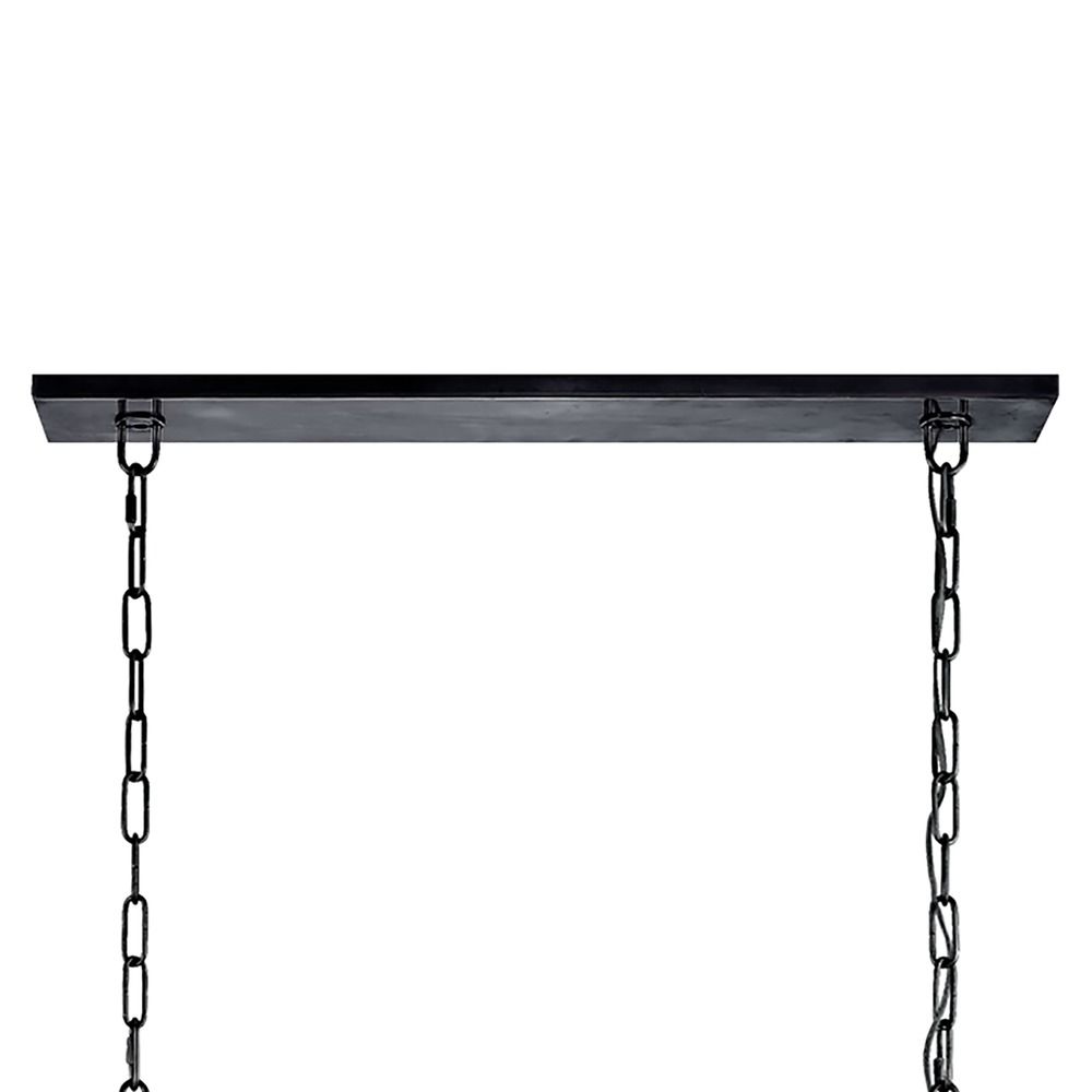 Update your dining room or kitchen island with Kelly Wearstler's Liaison Large Linear Chandelier by Visual Comfort. The Liaison features a long, linear style - simple yet sophisticated. This fixture has cylindrical clear crackle glass, as well as a rich Bronze finish. The Liaison requires six 60W maximum candelabra base C11 light bulbs. Clear or vintage bulbs are recommended. This fixture is rated for Damp Location.