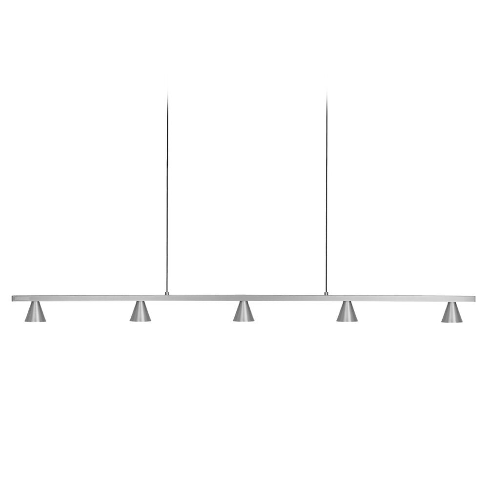 Multiple aluminum cones are connected inline and direct light downwards from the geometric linear pendant. The Dune series utilizes classic minimalist lamp shapes yet in reduced scale to elegant effect. The LED spot sources are focused by diminutive reflectors housed within the exquisitely turned shades. Available in multiple configurations and finishes.