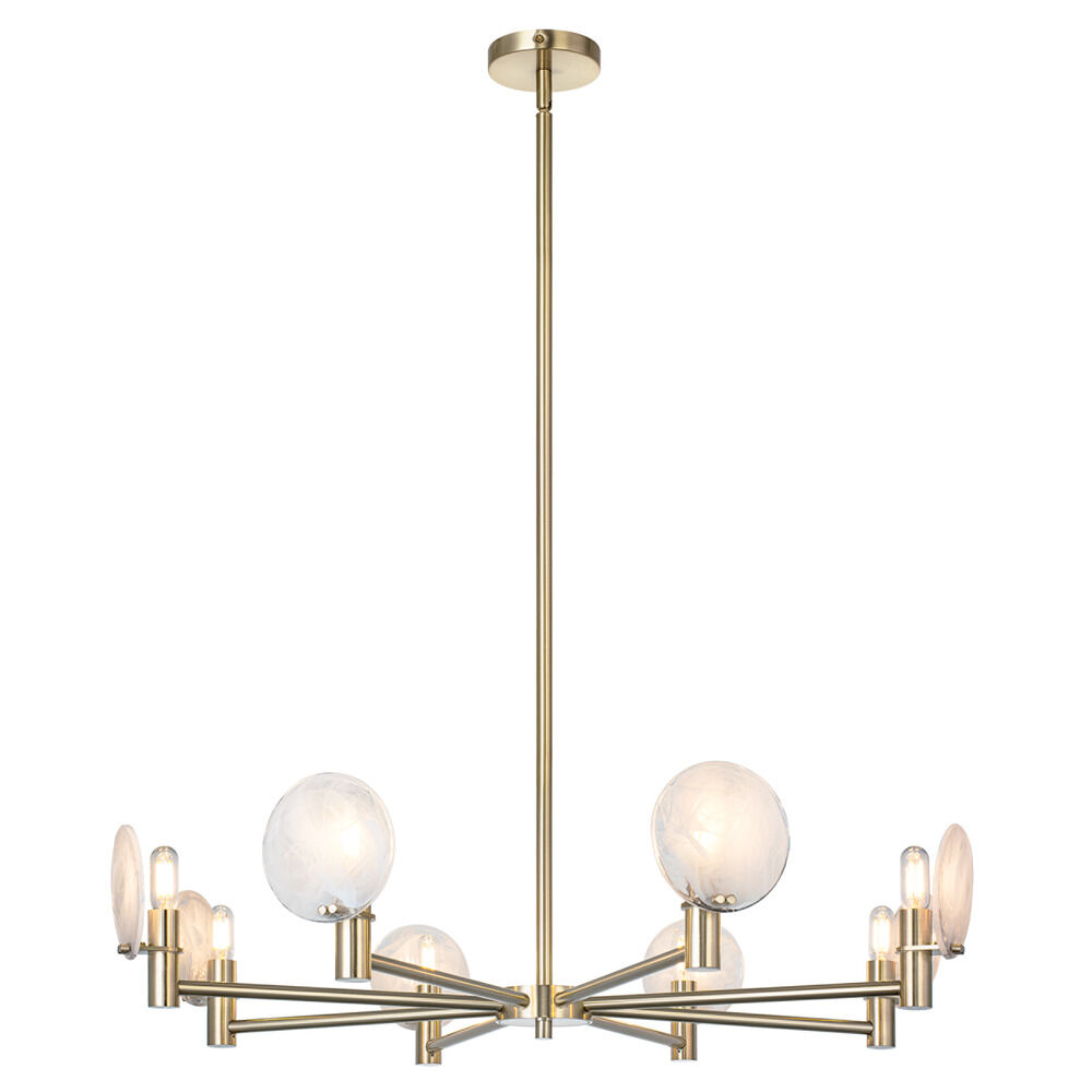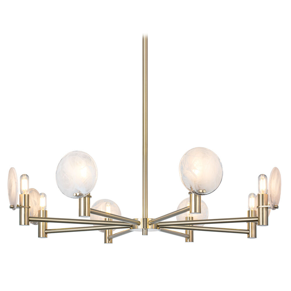 Mid-century modern champagne gold 8-light chandelier with hand blown white stri� disc glass shade