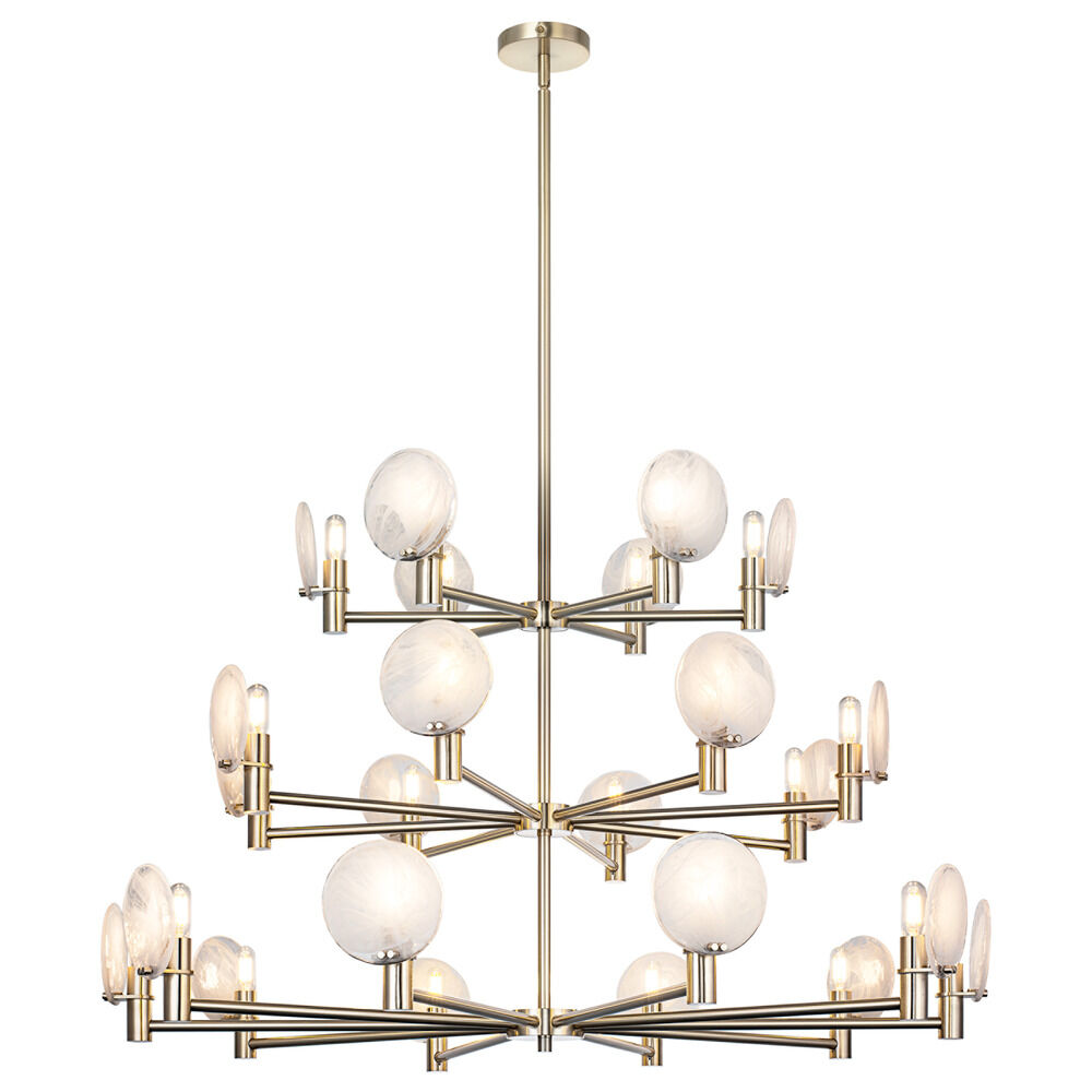 Mid-century modern champagne gold 24-light chandelier with hand blown white stri� disc glass shade