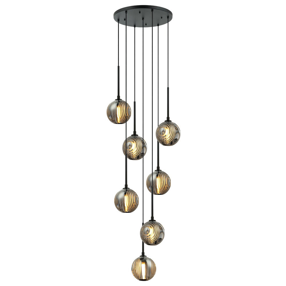 Contemporary / modern matte black 7-light pendant light with clear,frosted smoked & circular frosted groove glass shade