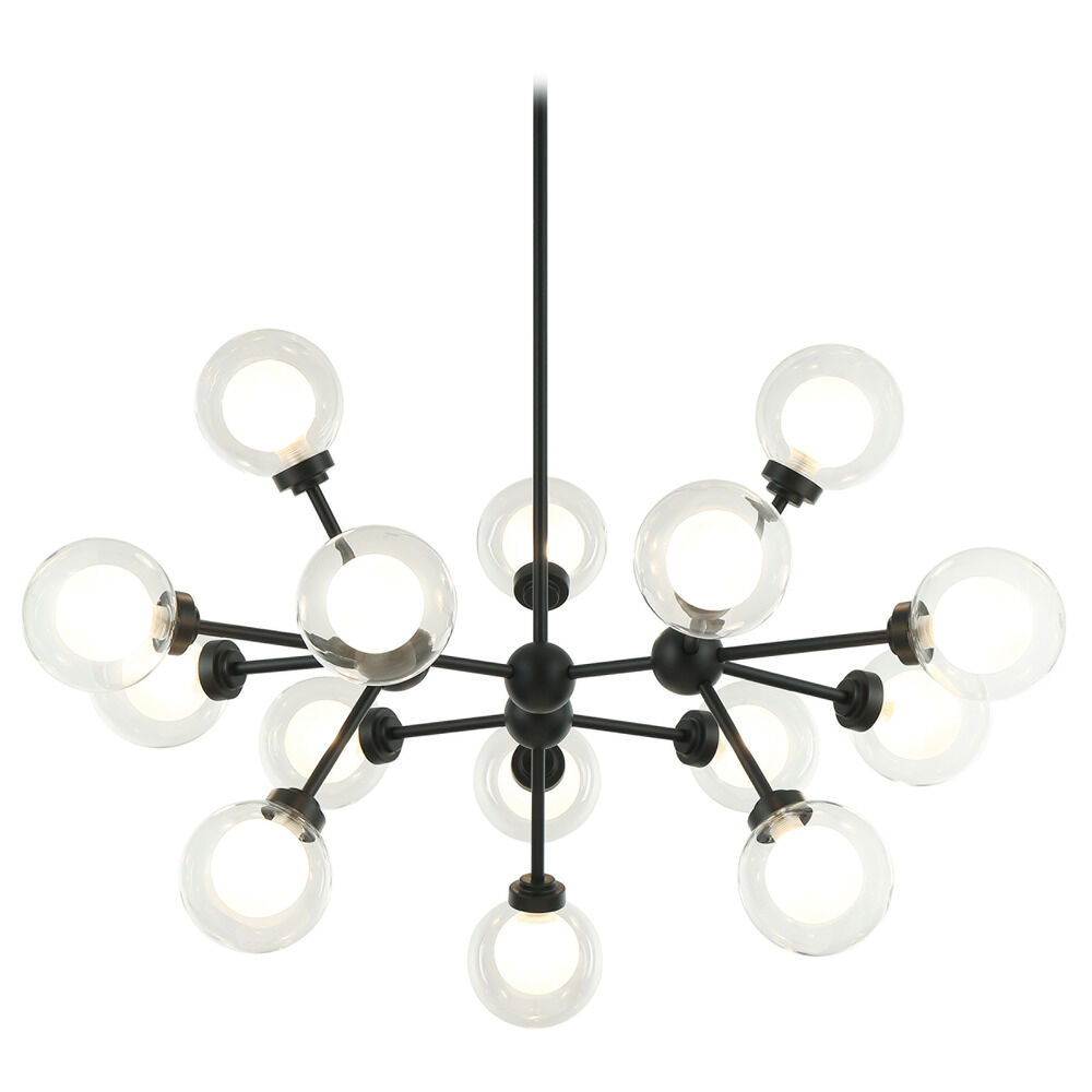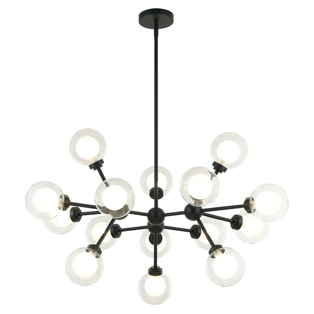 Mid-century modern matte black 15-light chandelier with white opal & clear glass shade
