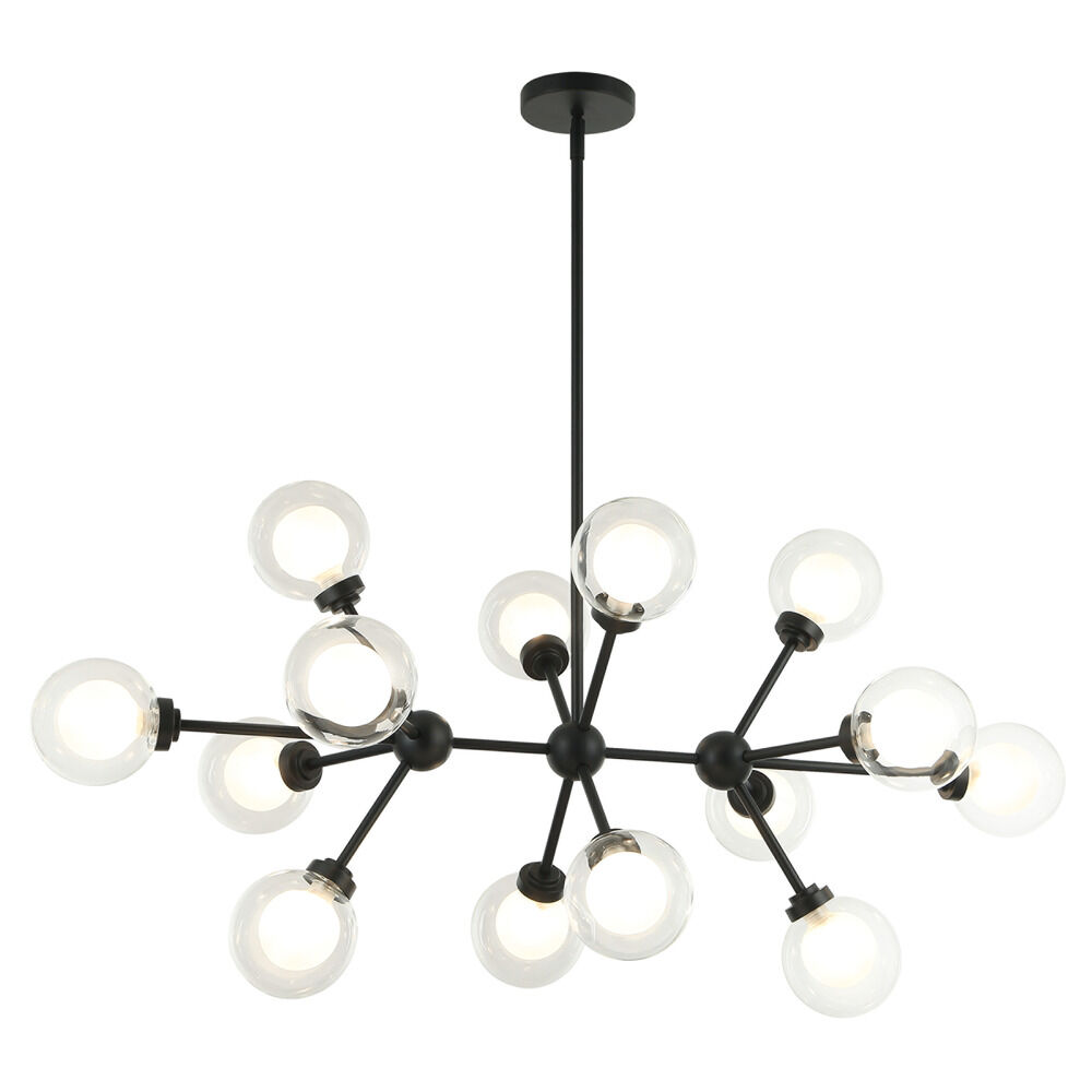 Mid-century modern matte black 14-light chandelier with white opal & clear glass shade