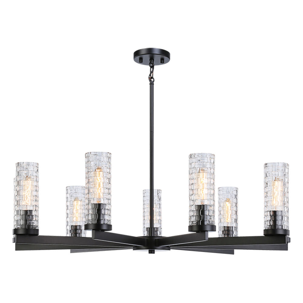 Contemporary / modern black 9-light chandelier with clear woven patterned glass shade