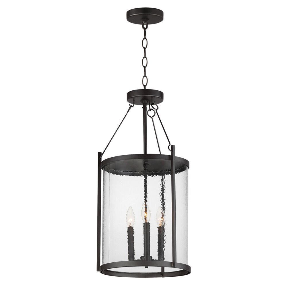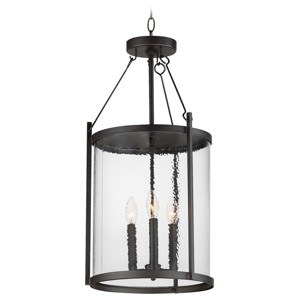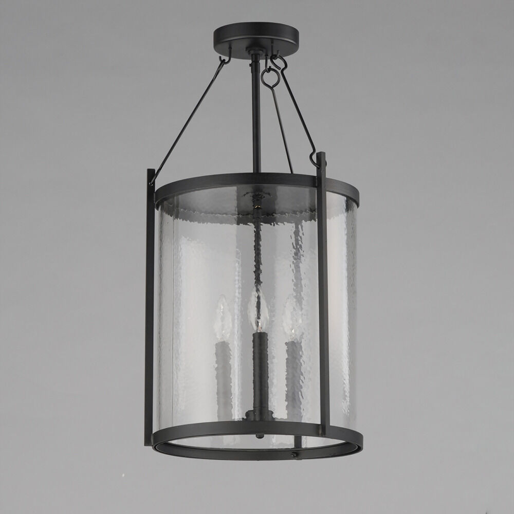 Transitional black 3-light outdoor ceiling light with clear,hammered hammer glass shade