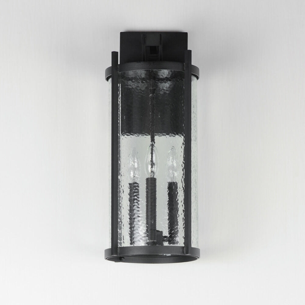 Transitional black 3-light outdoor wall light with clear,hammered hammer glass shade