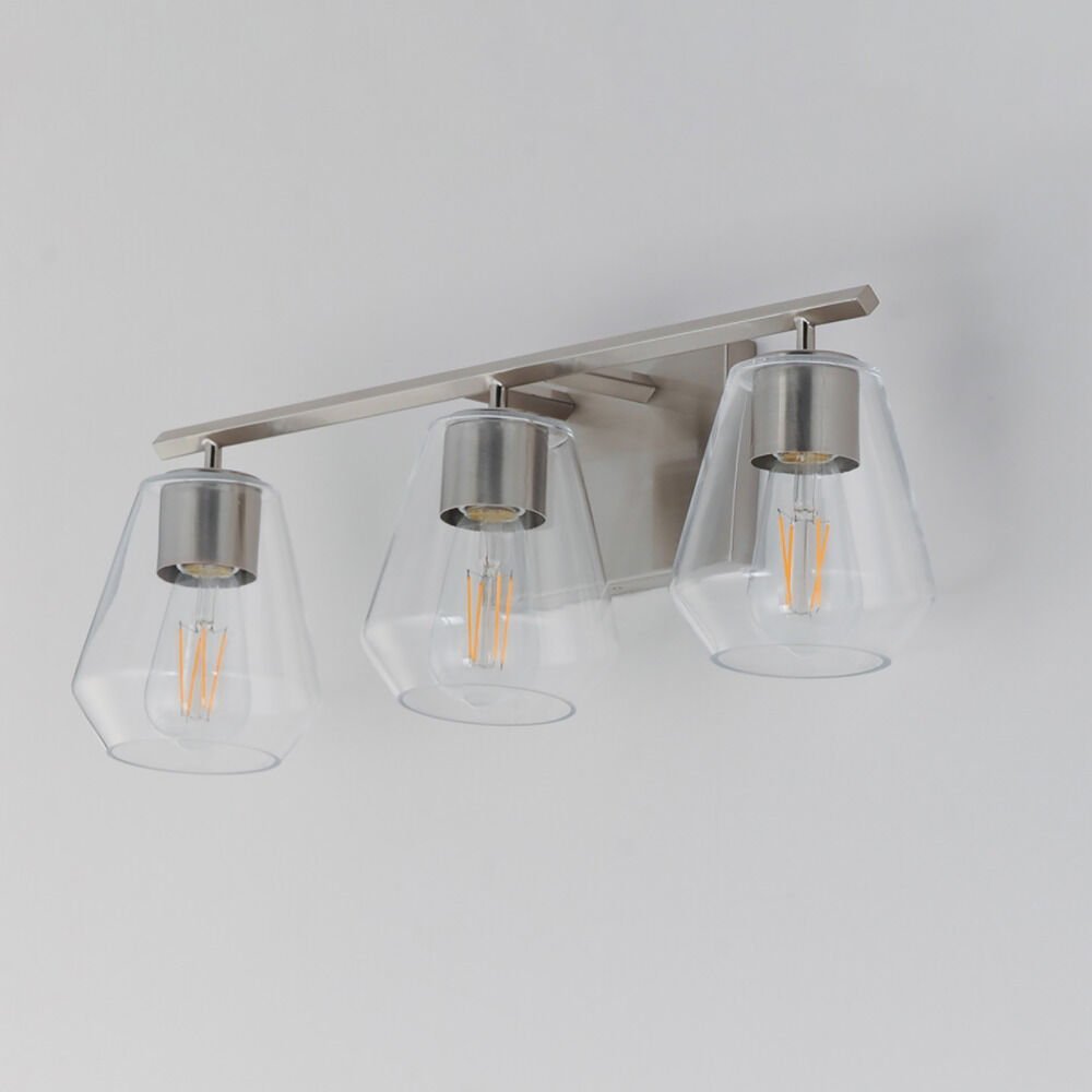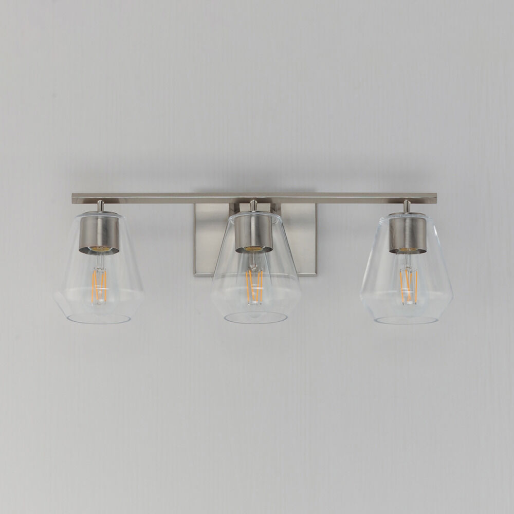Contemporary / modern satin nickel 3-light bathroom light with clear glass shade