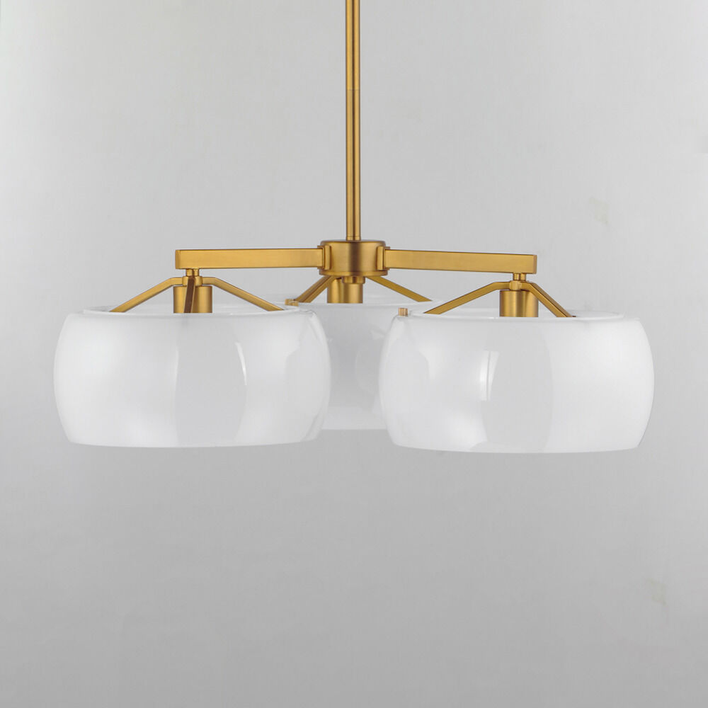 Contemporary / modern natural aged brass 3-light chandelier with glossy white glass shade