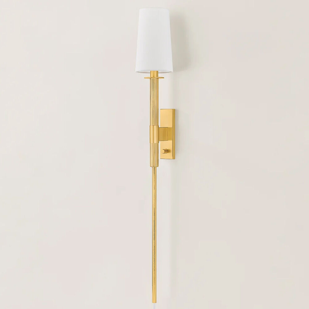 The slender stem of Ginny has a secret. This design-forward sconce cleverly hides its cord, creating a seamless and luxurious look when placed behind a nightstand, desk, or sofa. Finished in Aged Brass, the elongated silhouette is accented by a sleek bobeche, modern backplate, and a classic white linen shade.