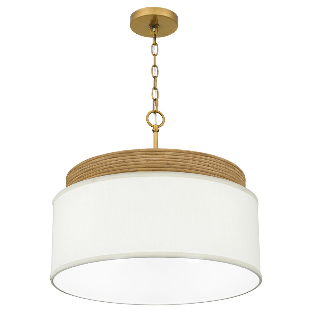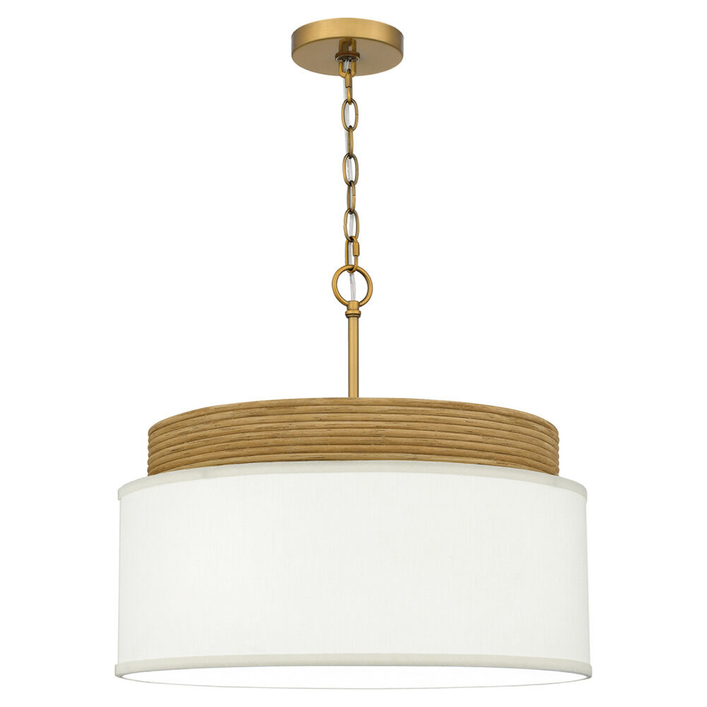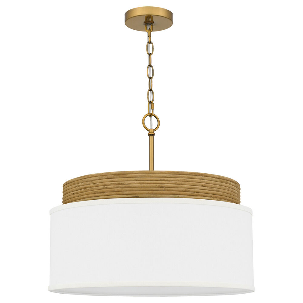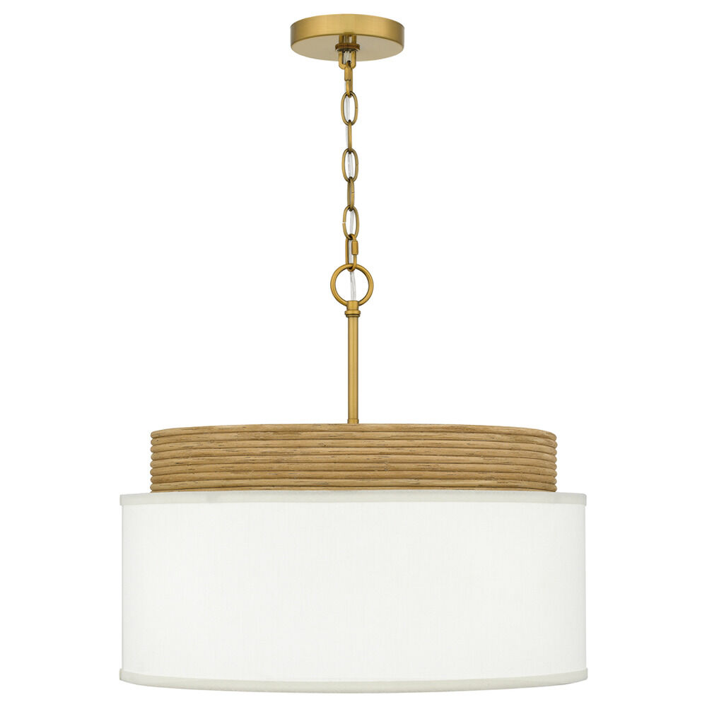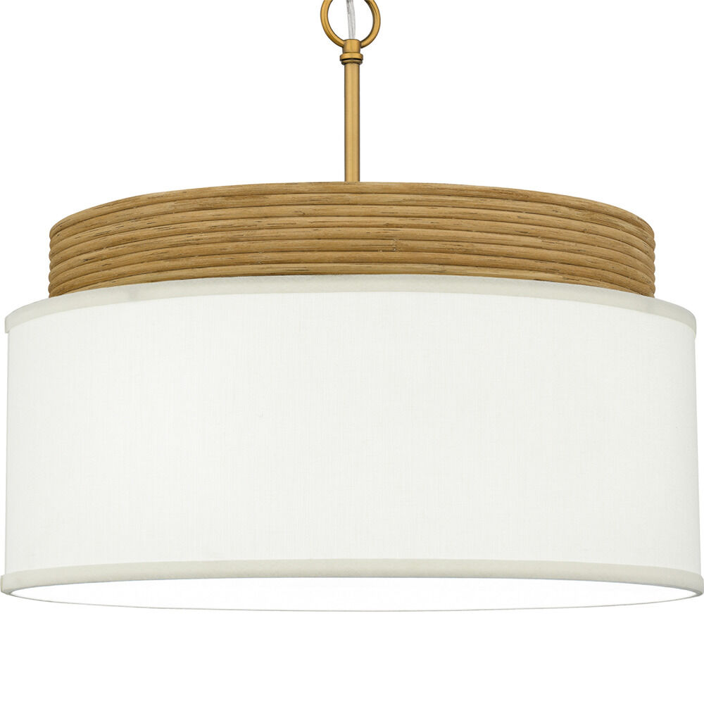 Lodge / rustic / cabin brushed gold & real rattan 4-light pendant light with white linen shade