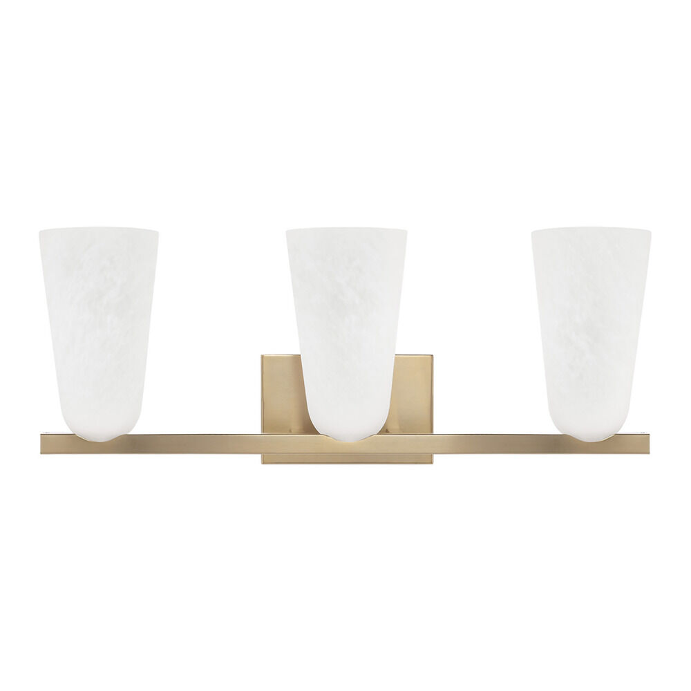 The Romy 3-Light Vanity Light in Matte Brass by Capital Lighting blends transitional elegance with modern refinement for a versatile bathroom fixture. Its elongated tapered shades, crafted from Faux Alabaster glass and gently curved at the base, create a soft ambient glow that brings warmth and depth to any powder room or bath. The design's subtle cut-away arm details add just the right amount of visual interest while maintaining a clean, simple silhouette.