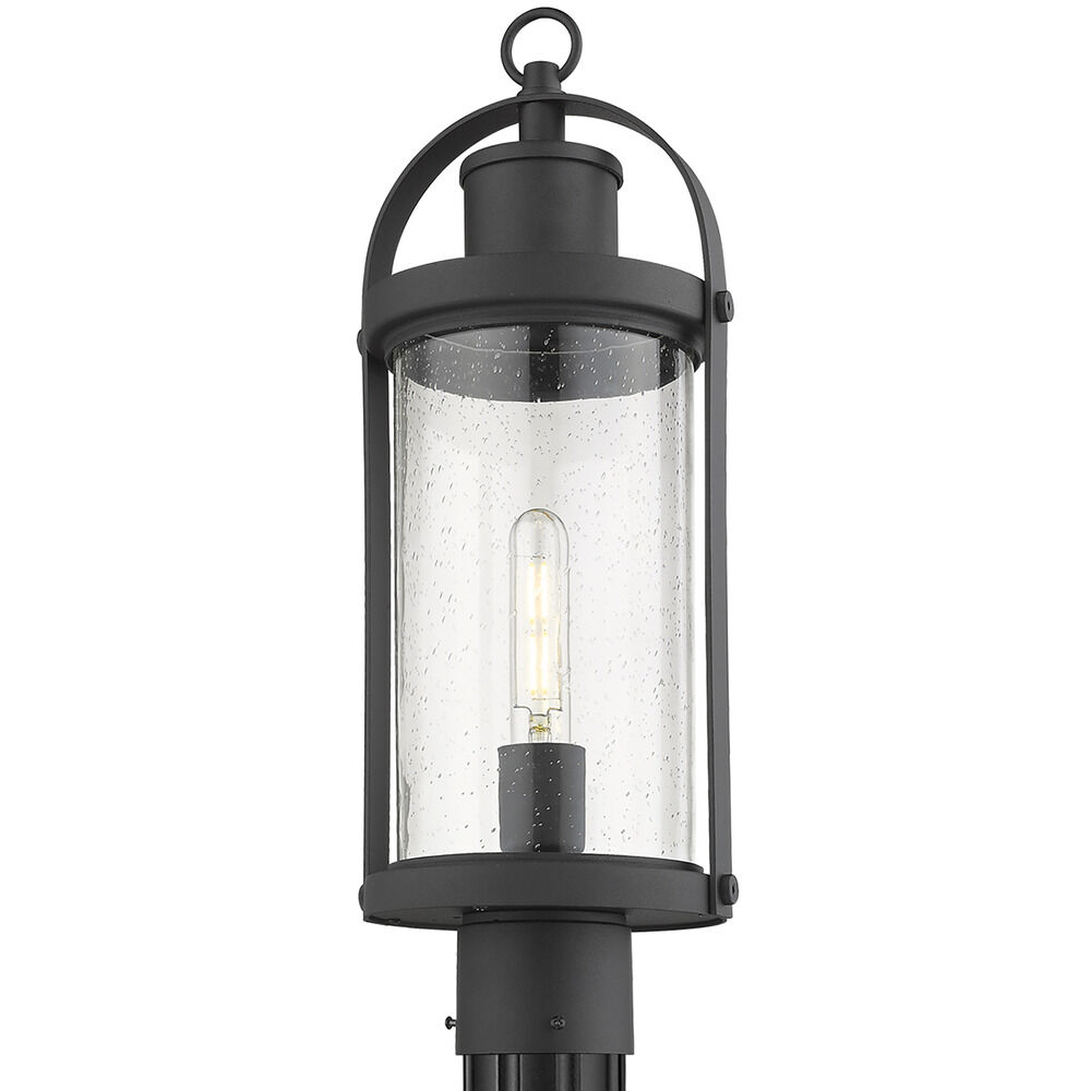 Transitional black 1-light post lighting with clear,seeded clear seeded glass shade