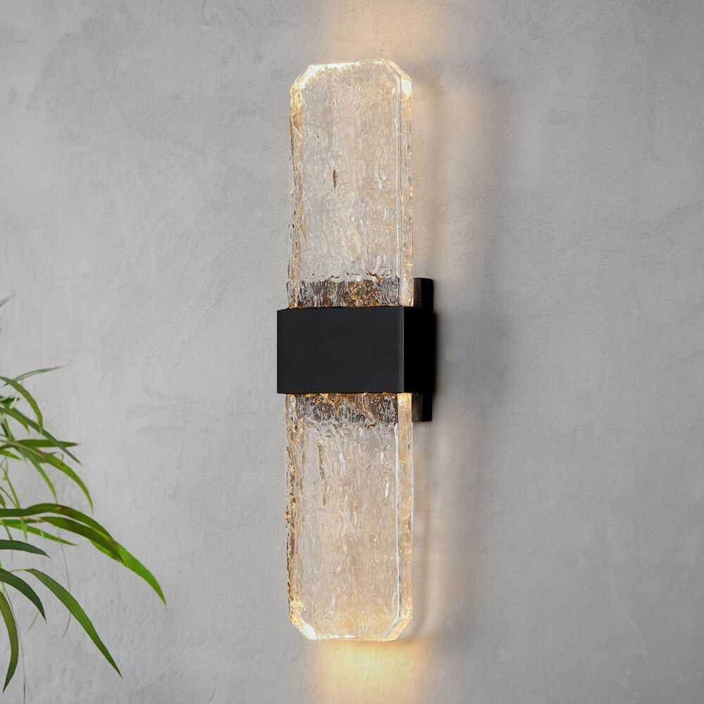 Illuminate the exterior of your modern home with ET2 Lighting's Rune 19-Inch LED Outdoor Wall Light. The Rune consists of artisanal cast glass slabs that are supported by a Die Cast Aluminum bracket in a Black finish. This sconce contains two integrated LED light sources and is non-dimmable. It is rated for Wet Location.