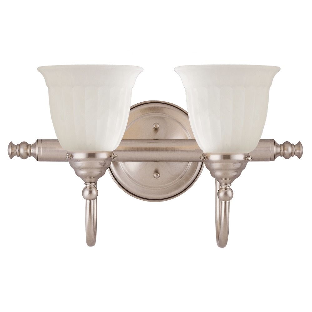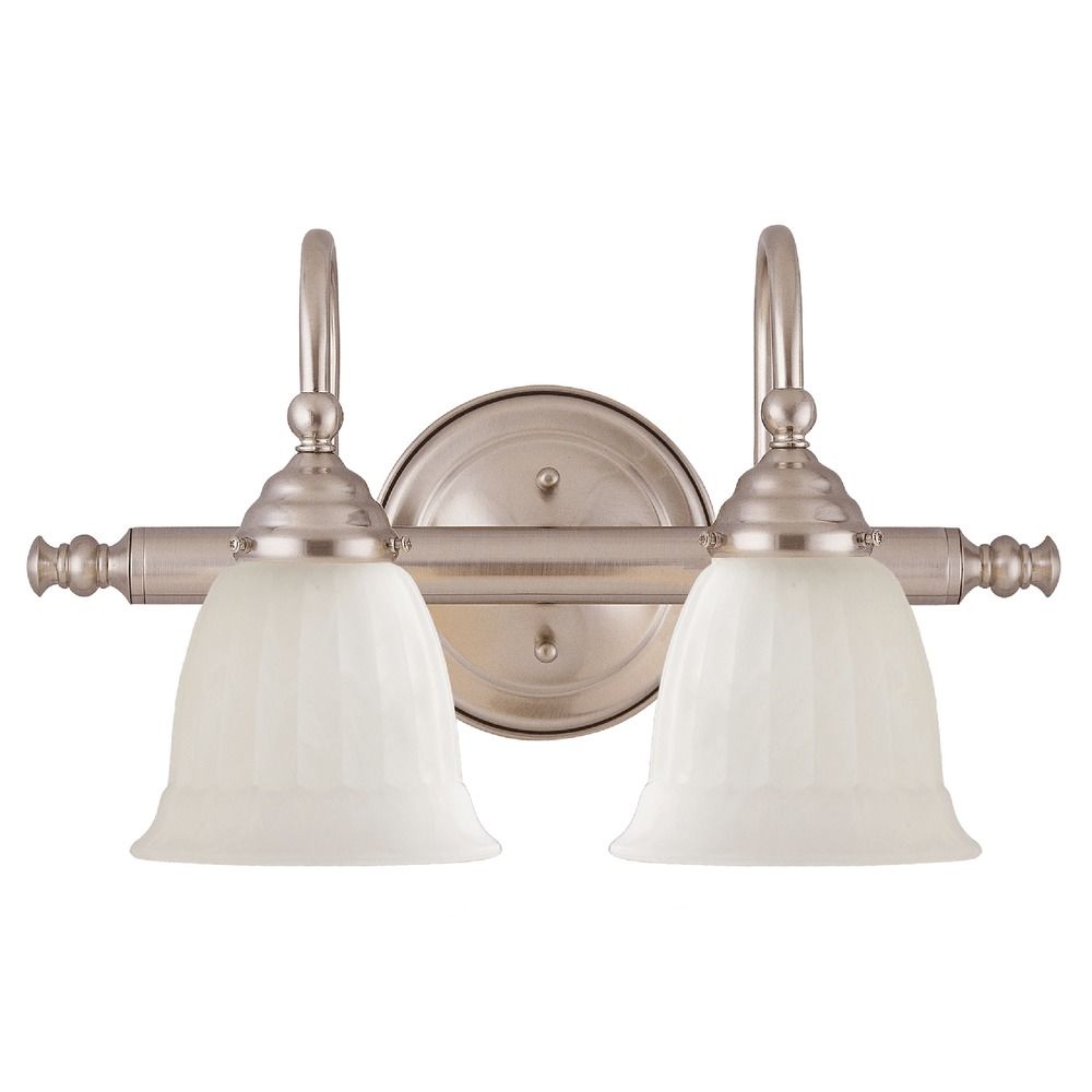 Traditional satin nickel 2-light bathroom light with glass shade