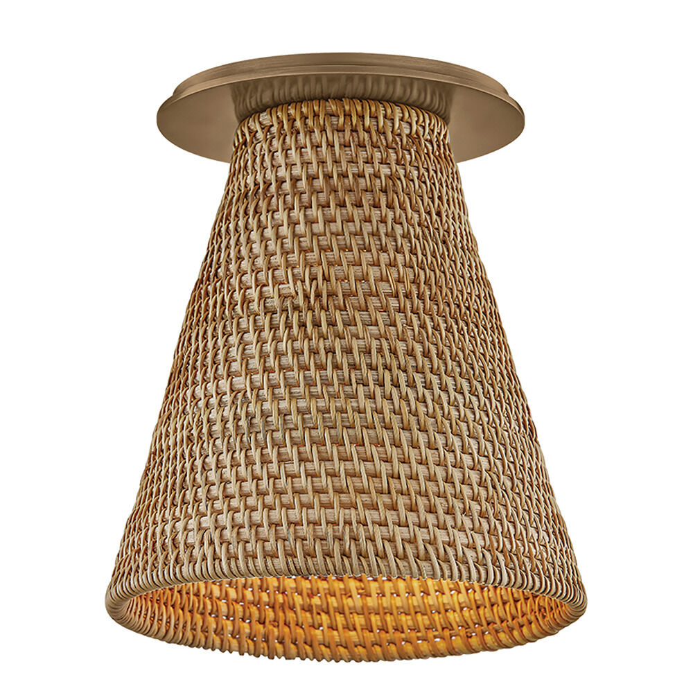 Organic patina brass 1-light indoor ceiling light with vintage natural wicker shade