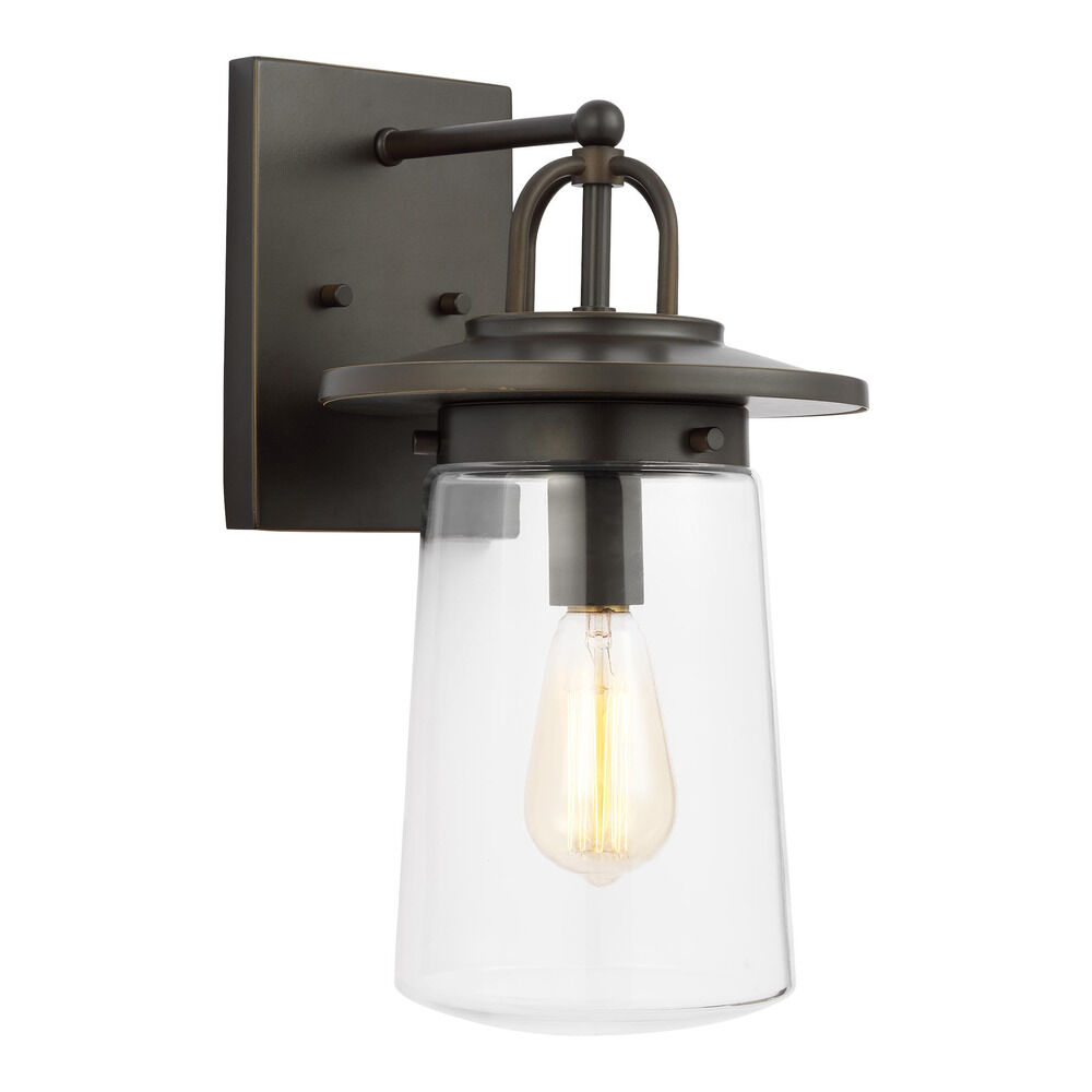 Transitional antique bronze 1-light outdoor wall light with clear glass shade