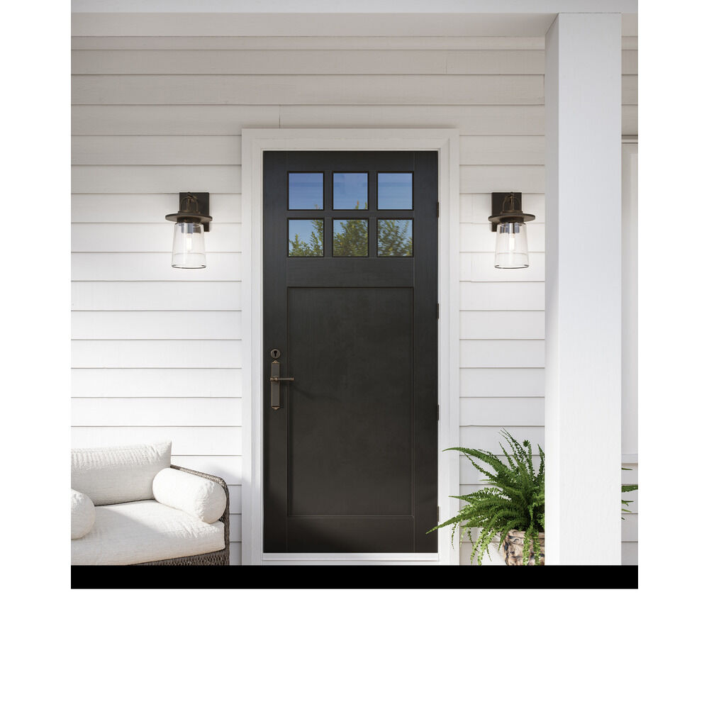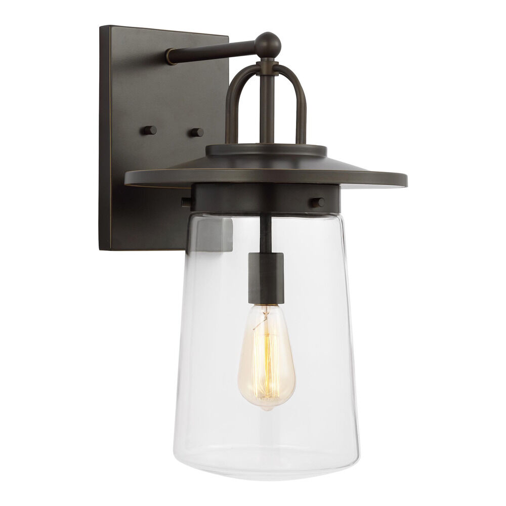 Transitional antique bronze 1-light outdoor wall light with clear glass shade