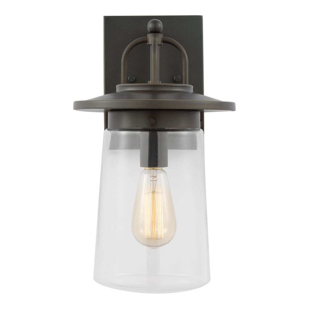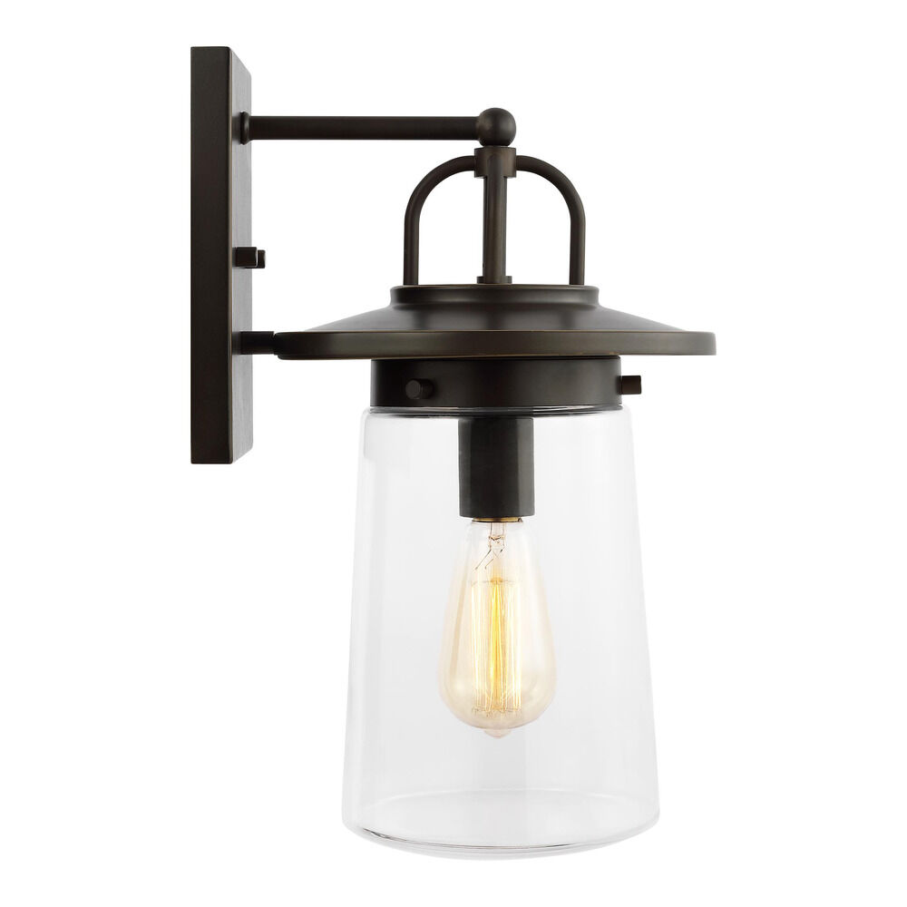 Transitional antique bronze 1-light outdoor wall light with clear glass shade