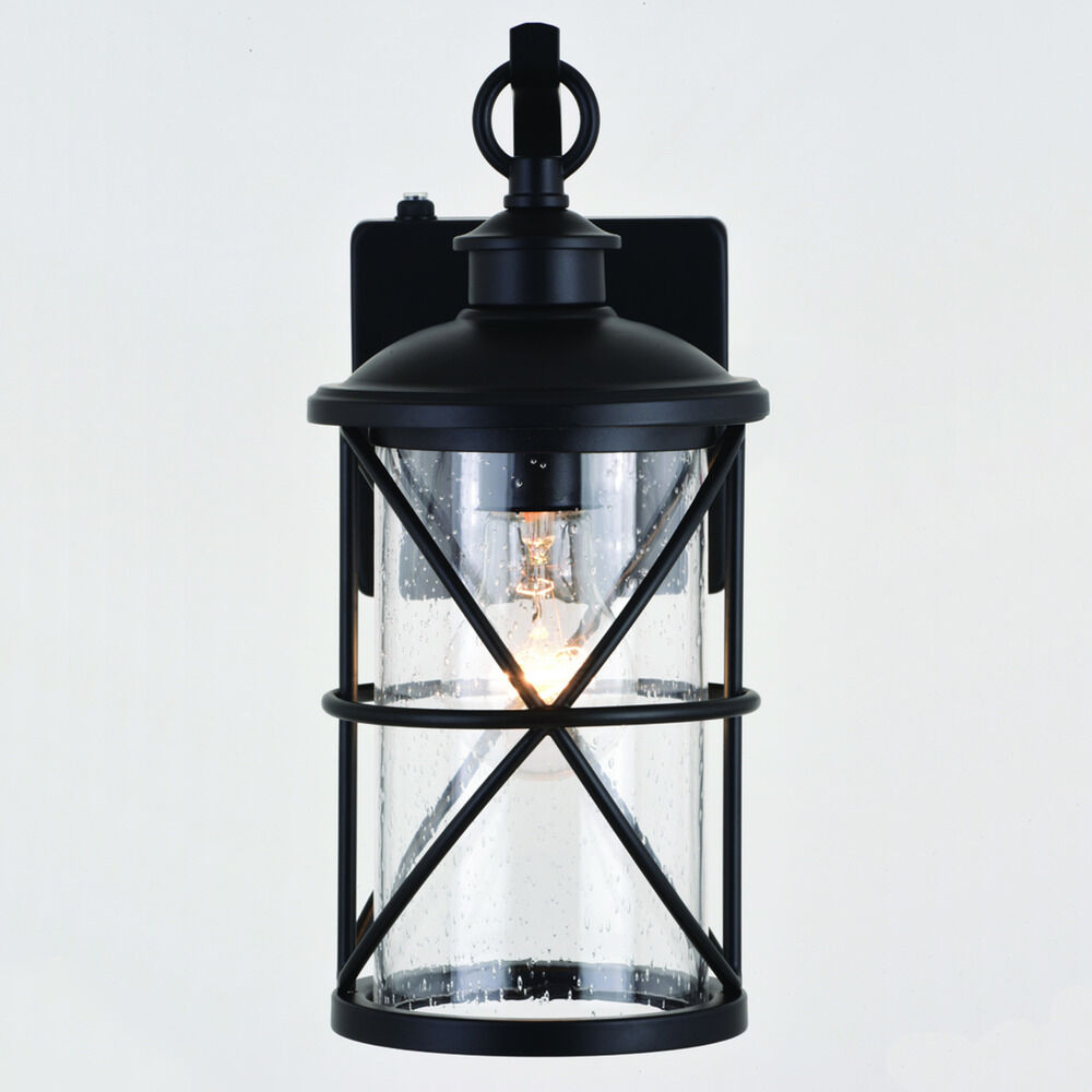Traditional black 1-light outdoor wall light with clear,seeded clear seeded glass shade