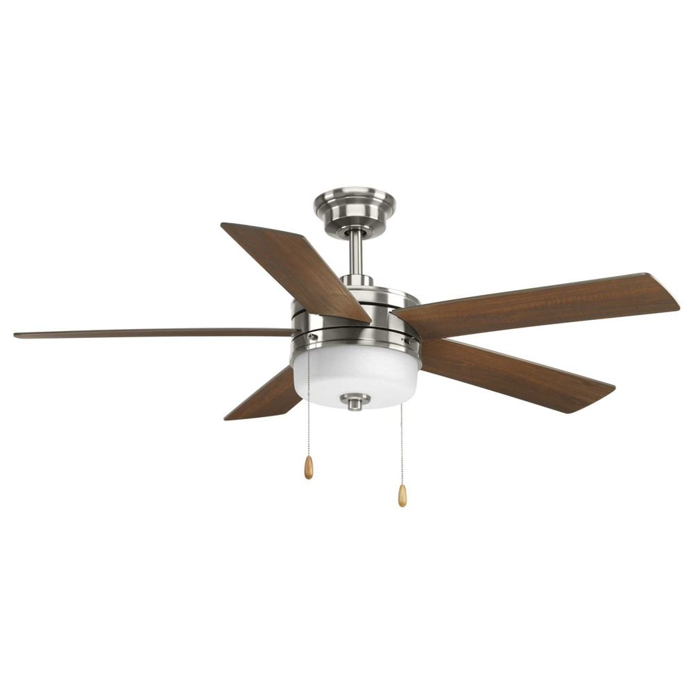 This five-blade 52 inch Verada ceiling fan combines a frosted linen glass shade with a 17W LED source. Five reversible blades in medium cherry and american walnut are included. Verada features a dual mount system and a three-speed pull chain fan switch, as well as an on/off pull chain switch to operate the light. LED light kit features a 3000K color temperature. Brushed Nickle finish.