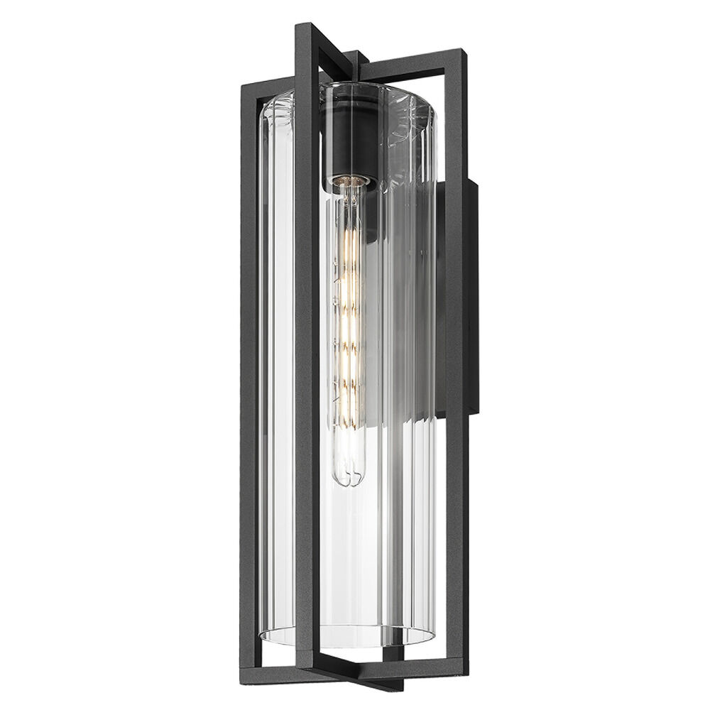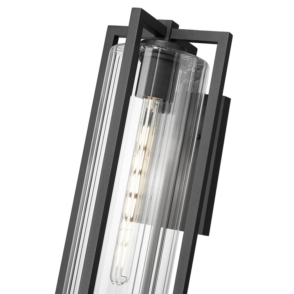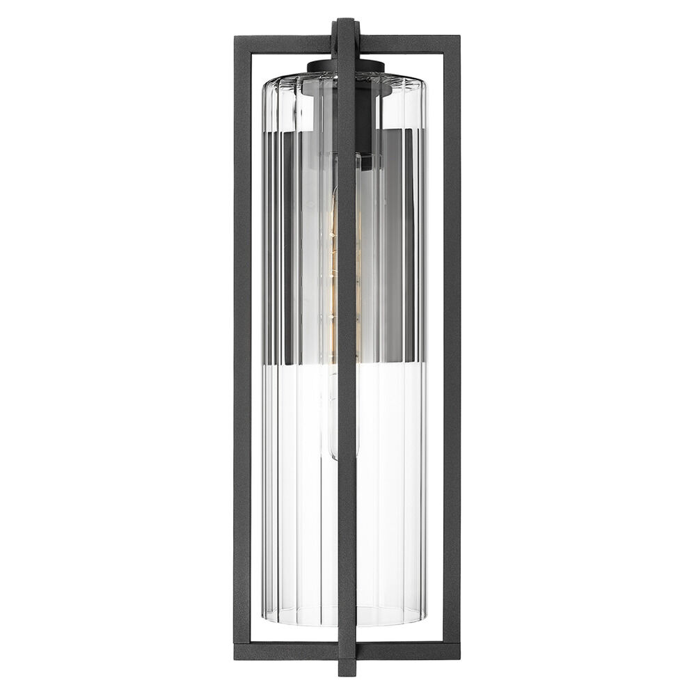 Transitional black 1-light outdoor wall light with clear,ribbed clear ribbed glass shade