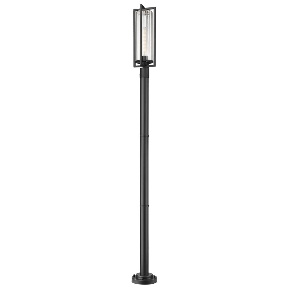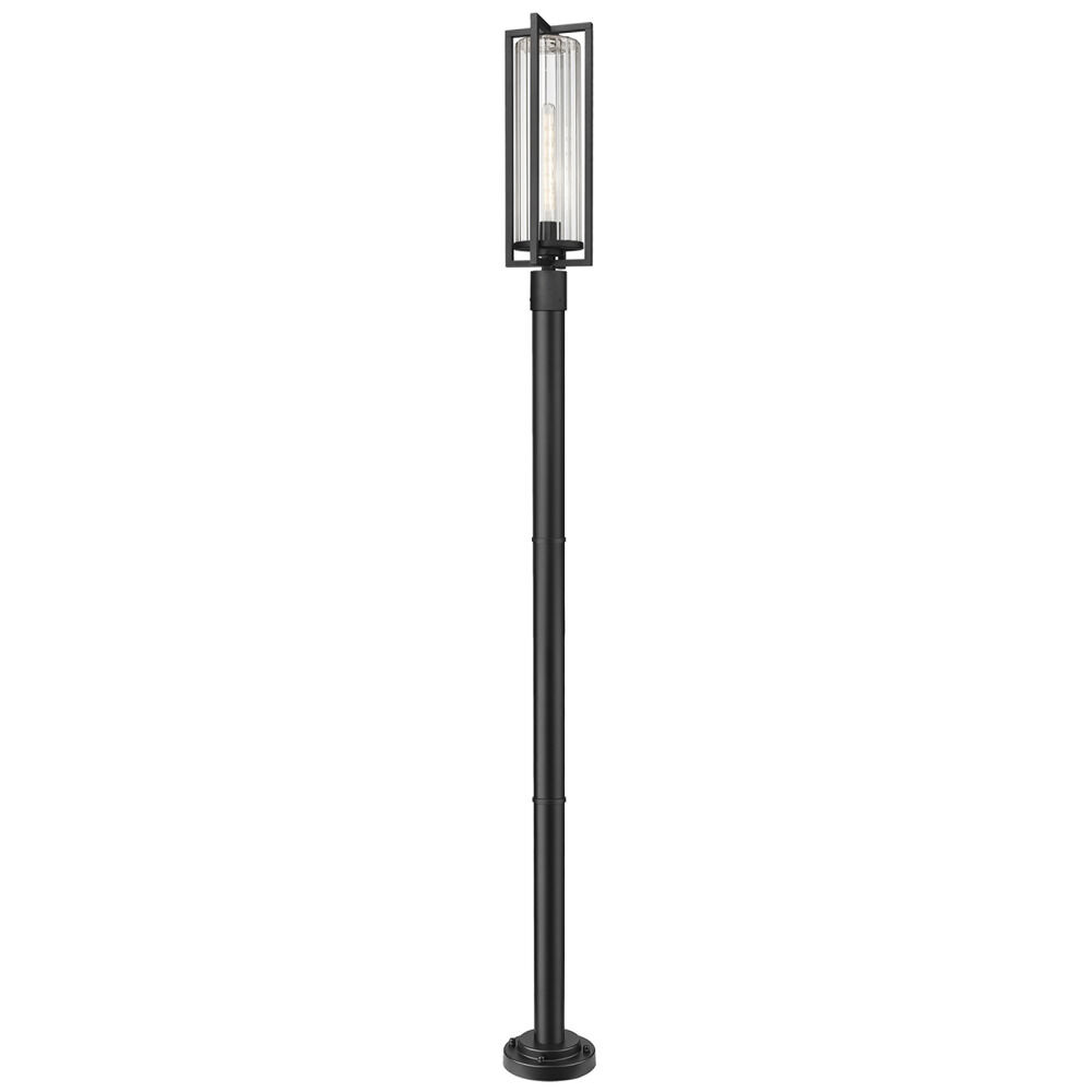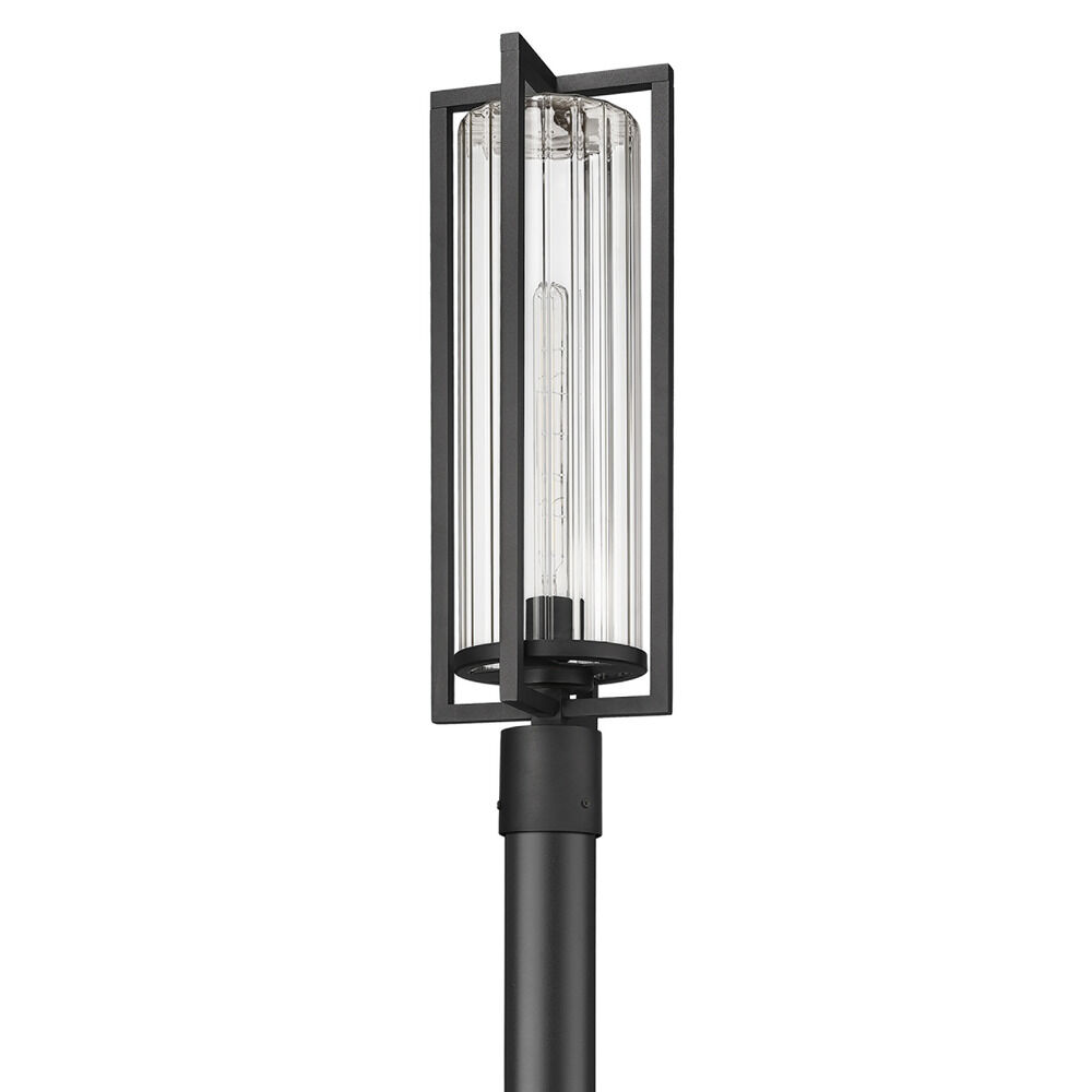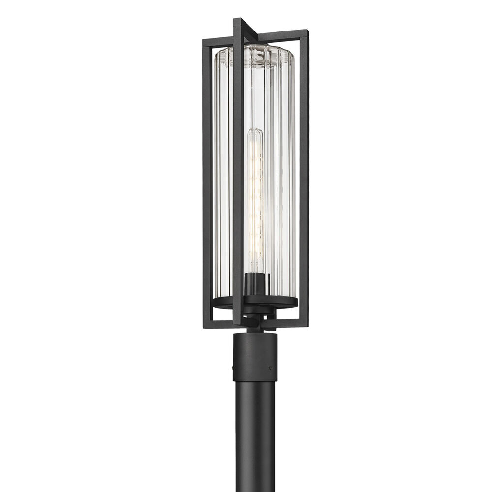 Transitional black 1-light post lighting with clear,ribbed clear ribbed glass shade