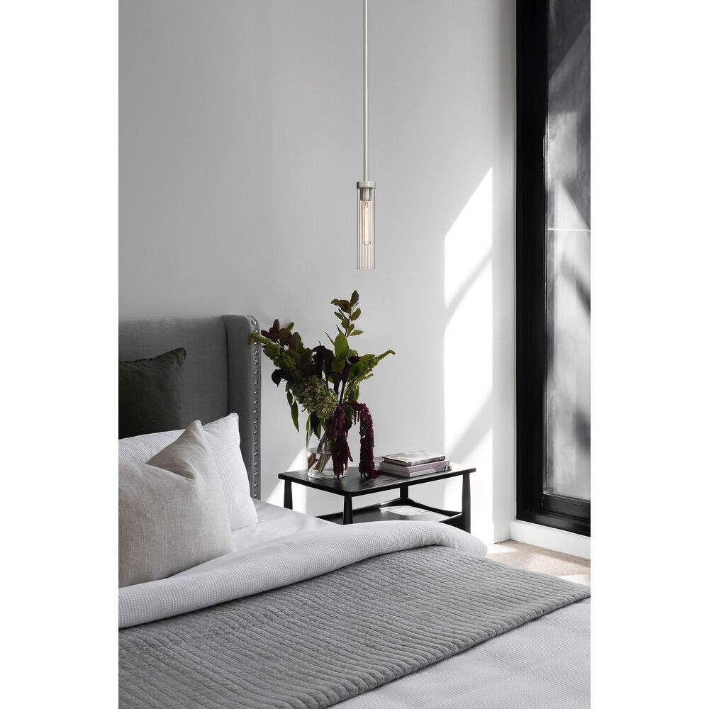 Contemporary / modern brushed nickel 1-light mini-pendant light with clear,ribbed clear glass shade