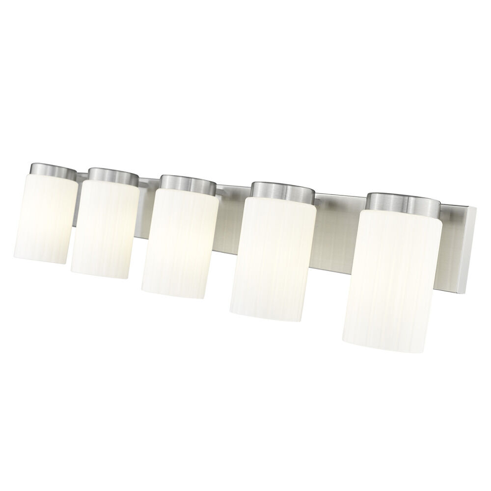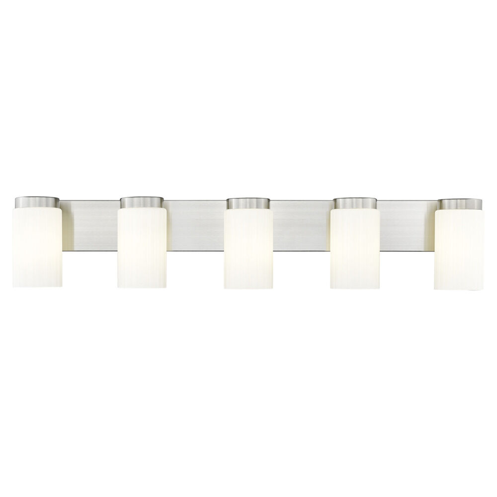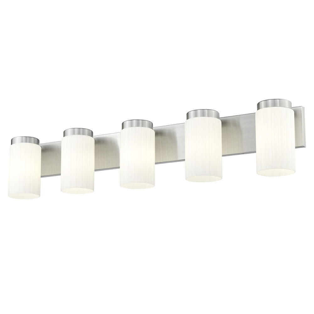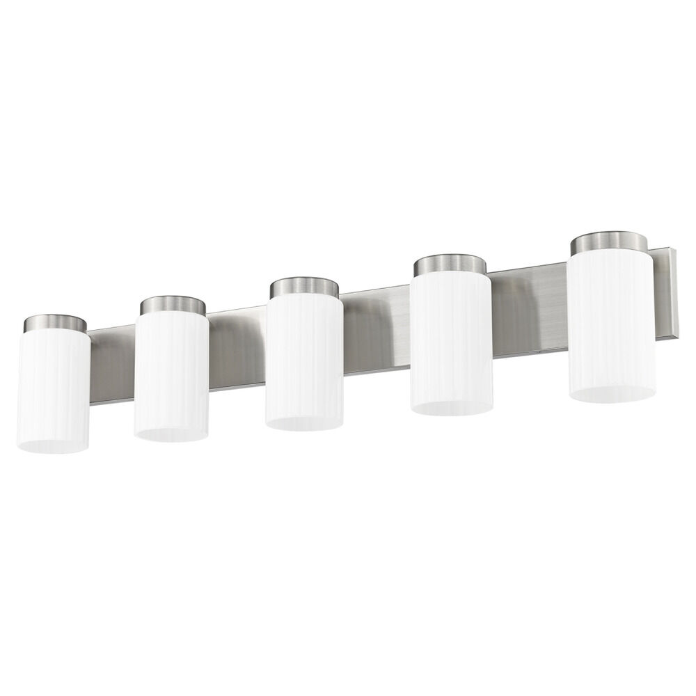 Contemporary / modern brushed nickel 5-light bathroom light with matte,fluted matte opal glass shade