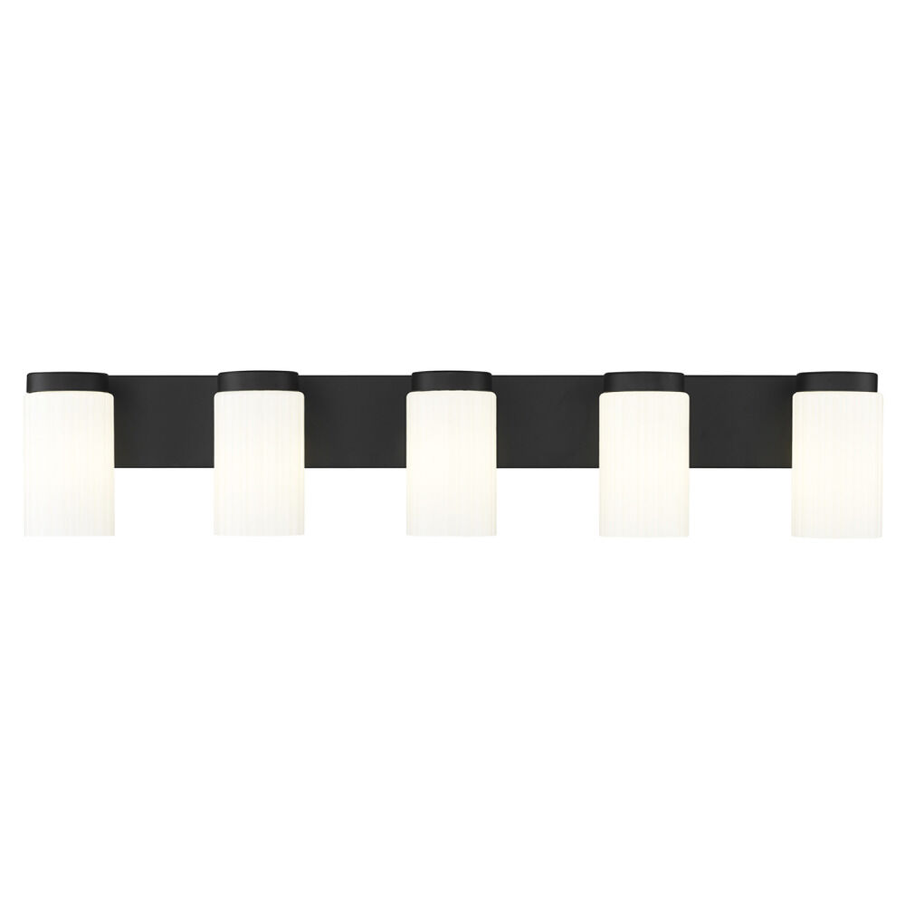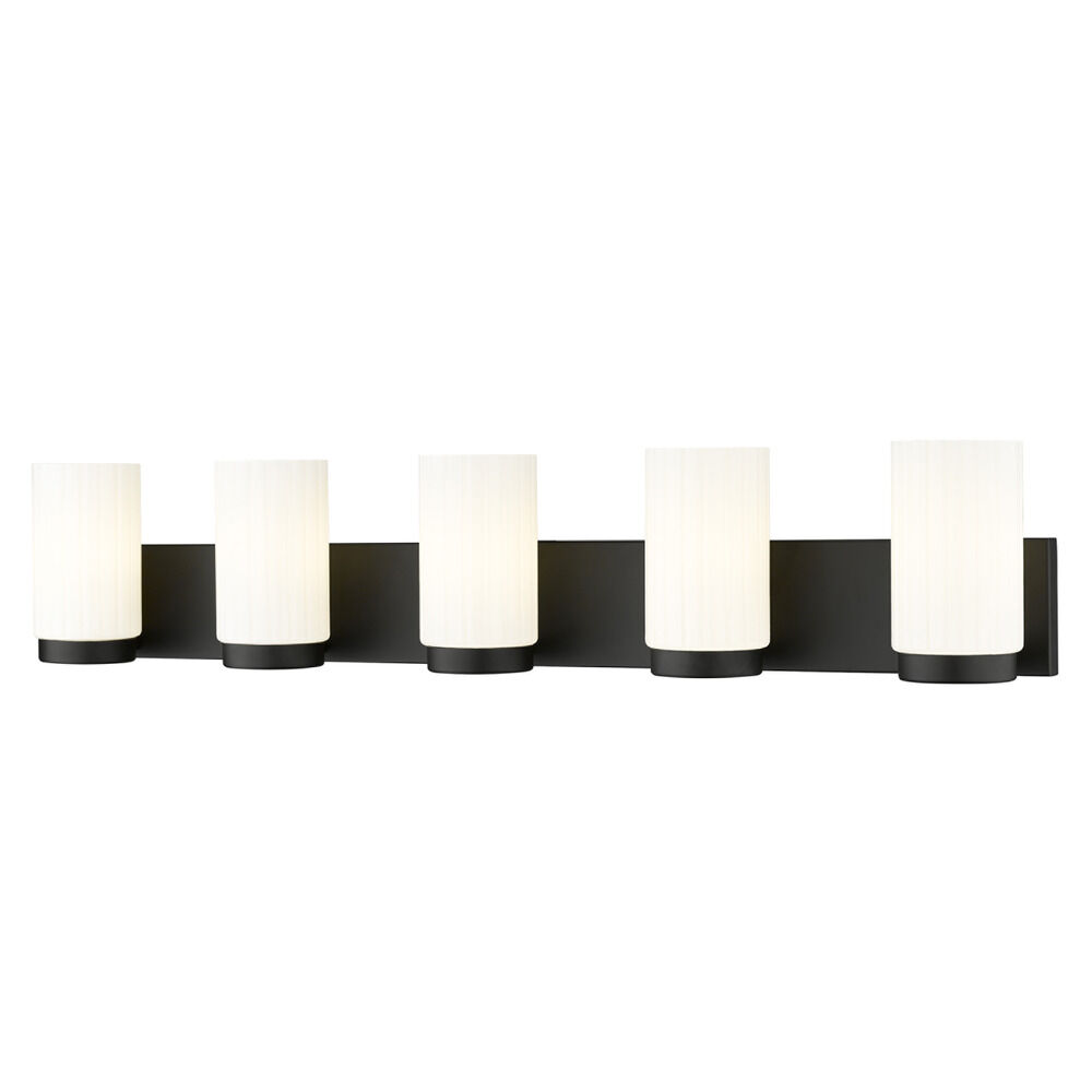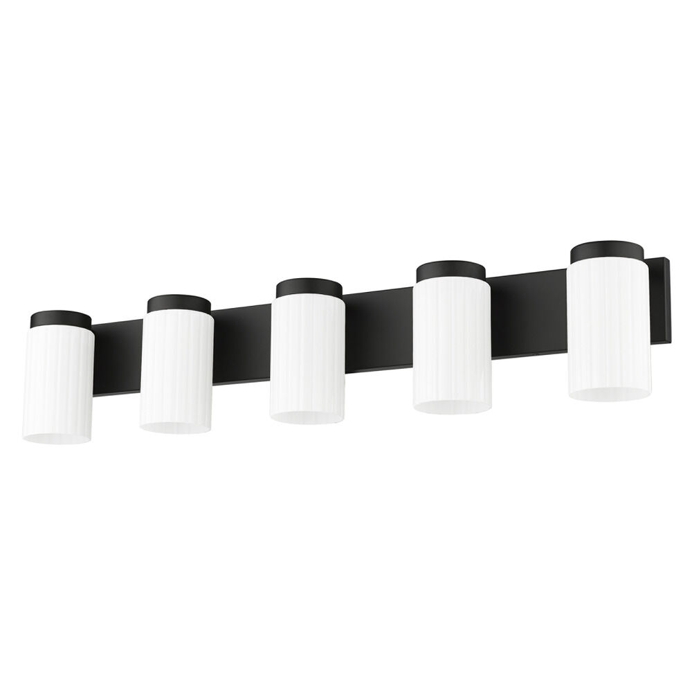 Contemporary / modern matte black 5-light bathroom light with matte,fluted matte opal glass shade