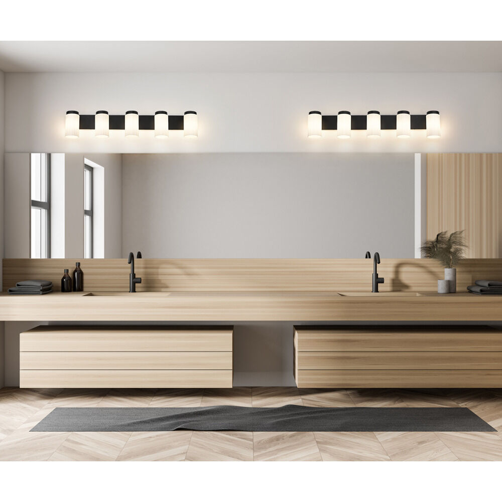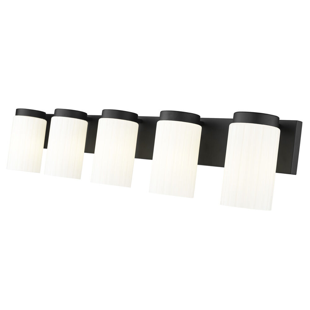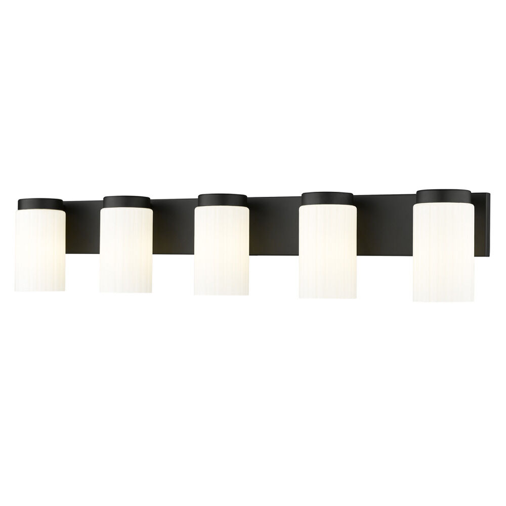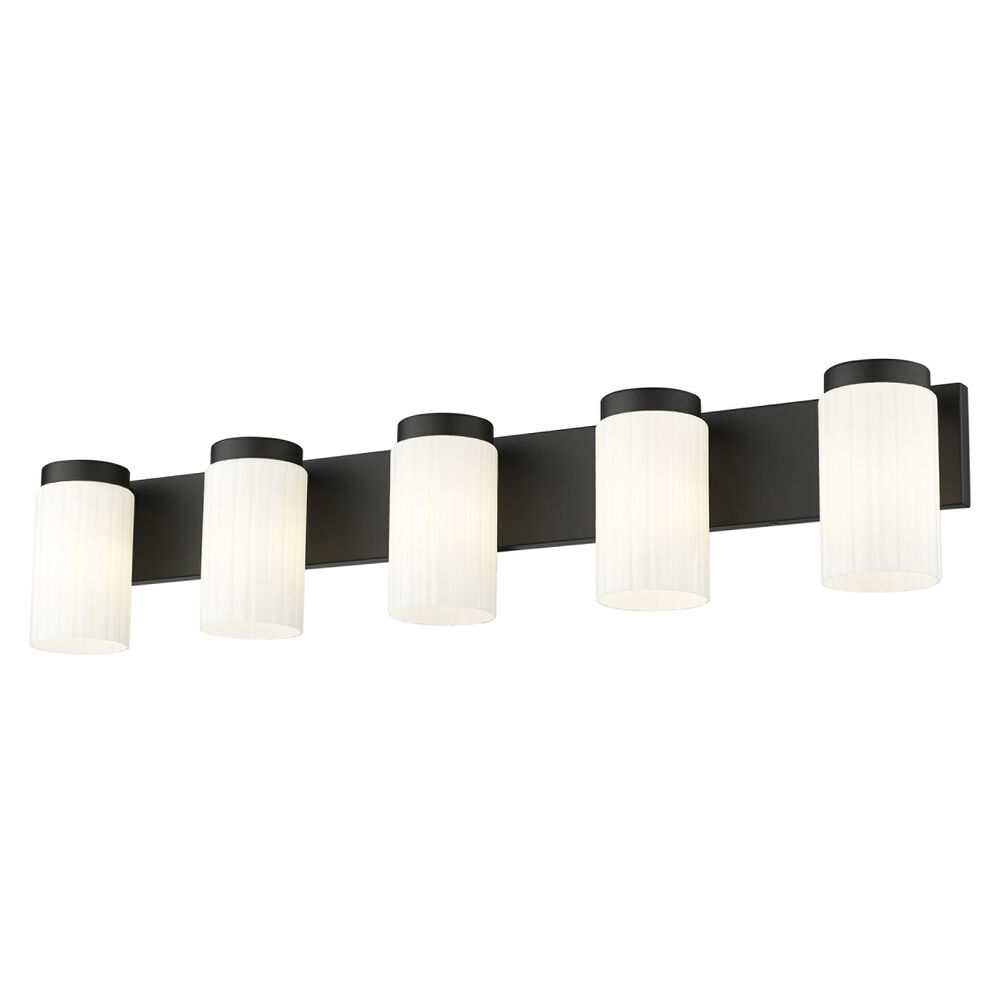 Contemporary / modern matte black 5-light bathroom light with matte,fluted matte opal glass shade