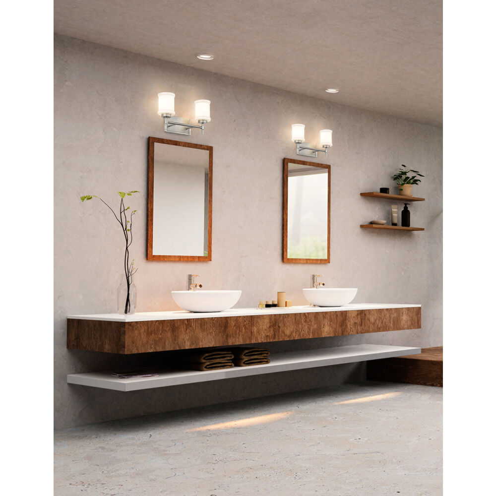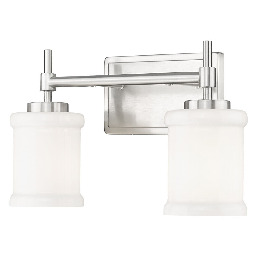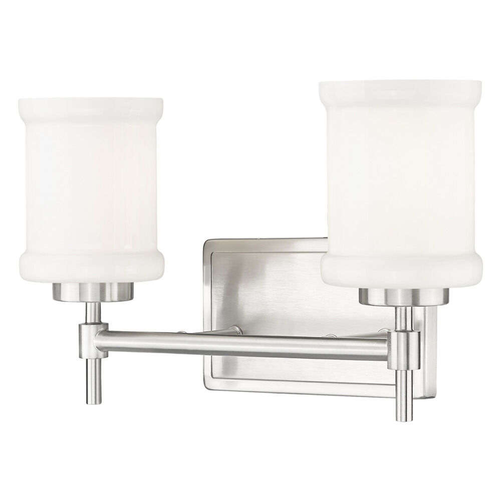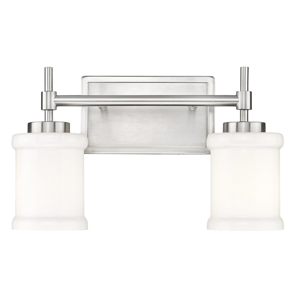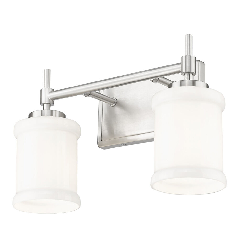 Contemporary / modern brushed nickel 2-light bathroom light with glossy gloss opal glass shade