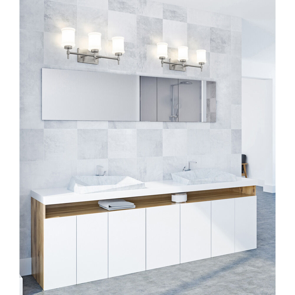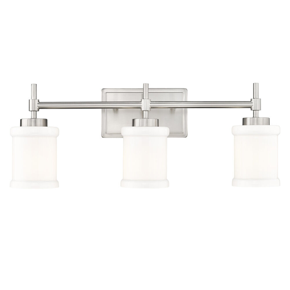 Contemporary / modern brushed nickel 3-light bathroom light with glossy gloss opal glass shade