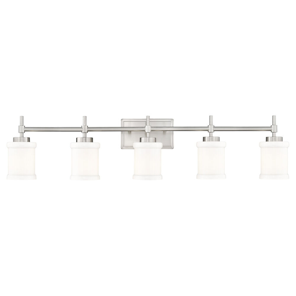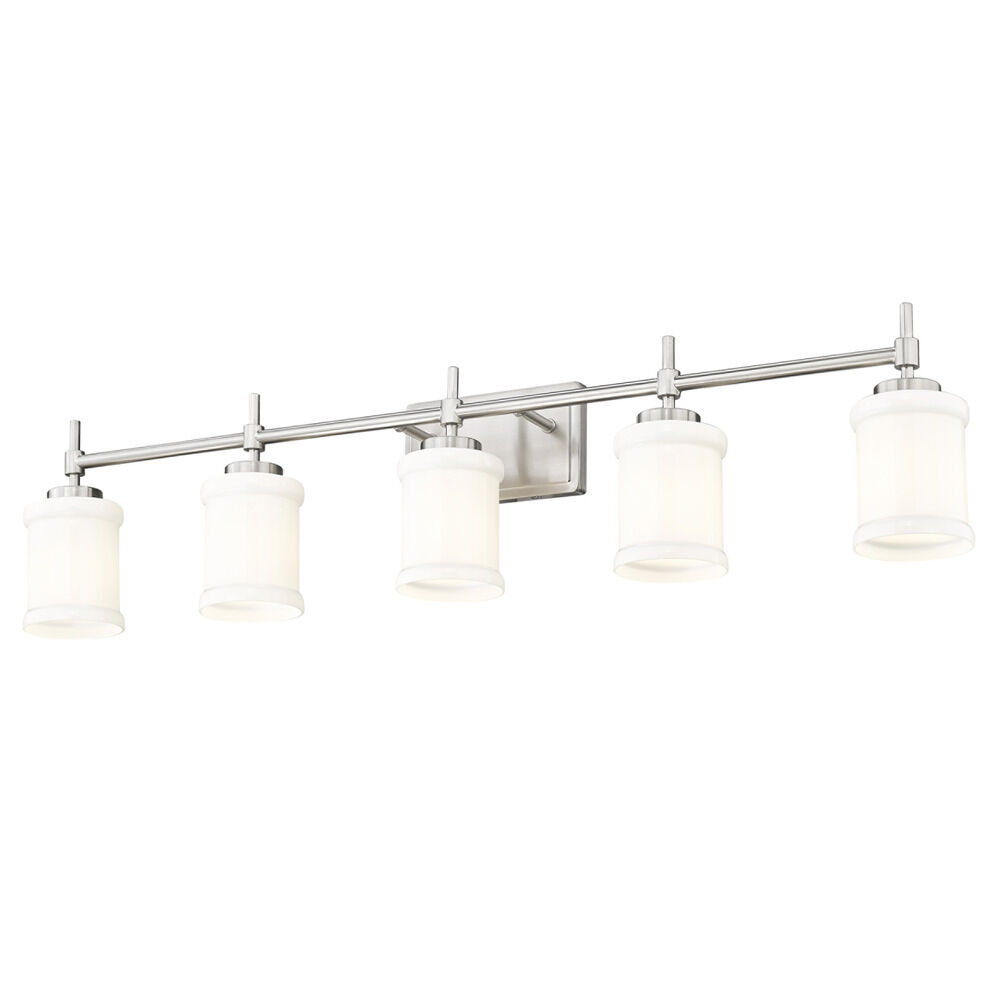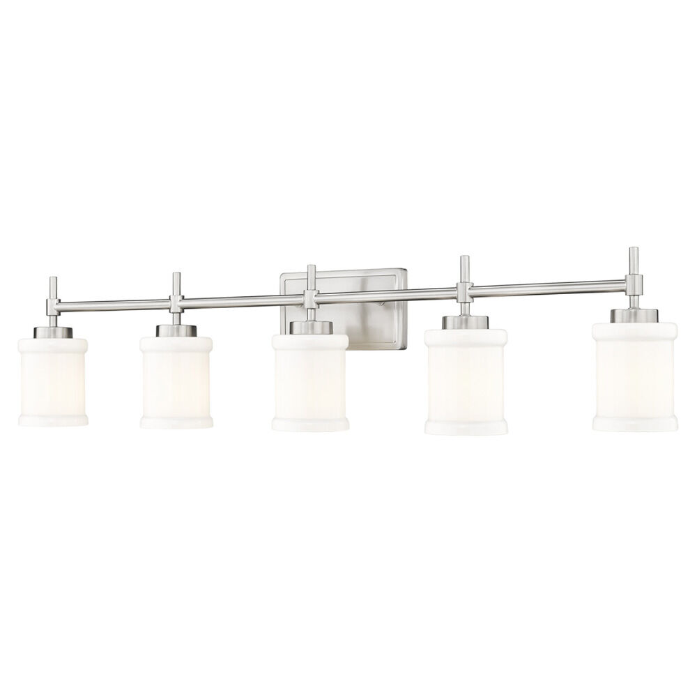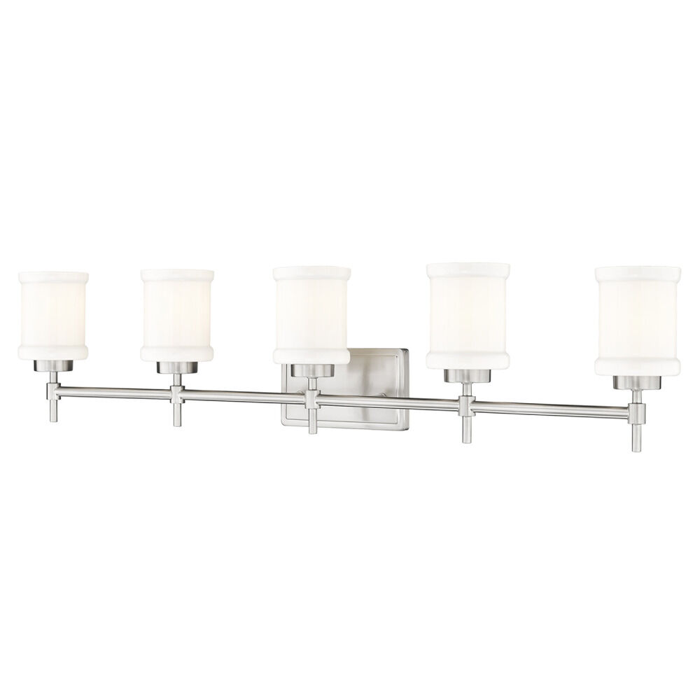 Contemporary / modern brushed nickel 5-light bathroom light with glossy gloss opal glass shade