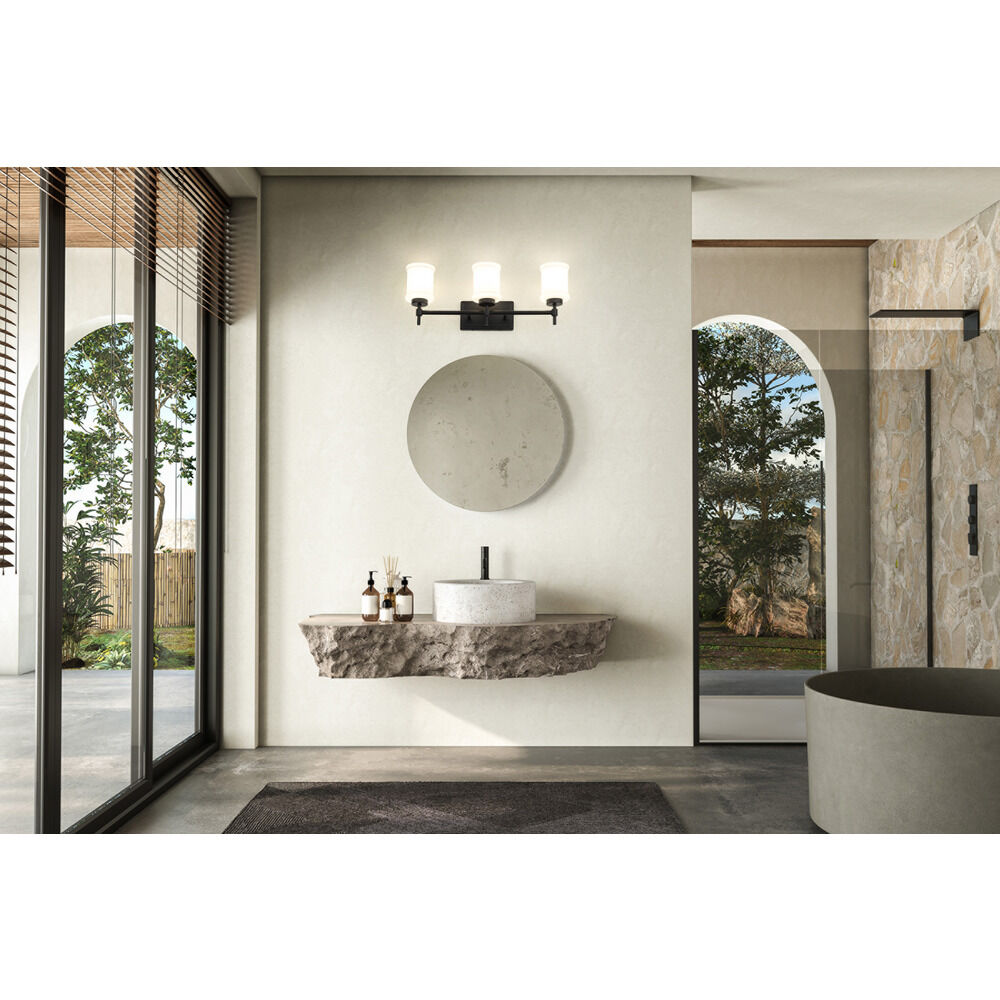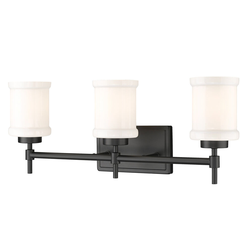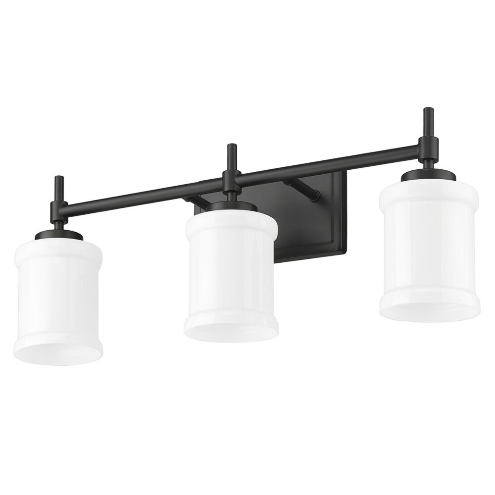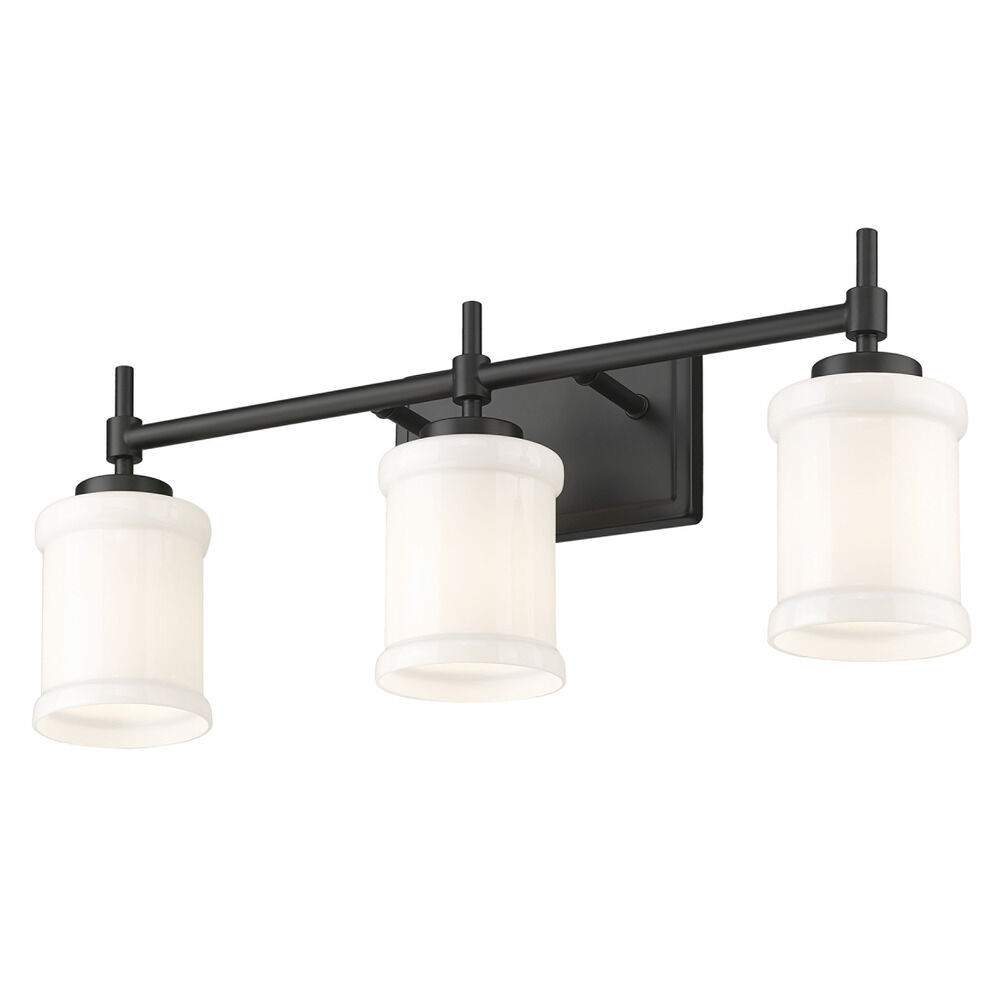 Contemporary / modern matte black 3-light bathroom light with glossy gloss opal glass shade
