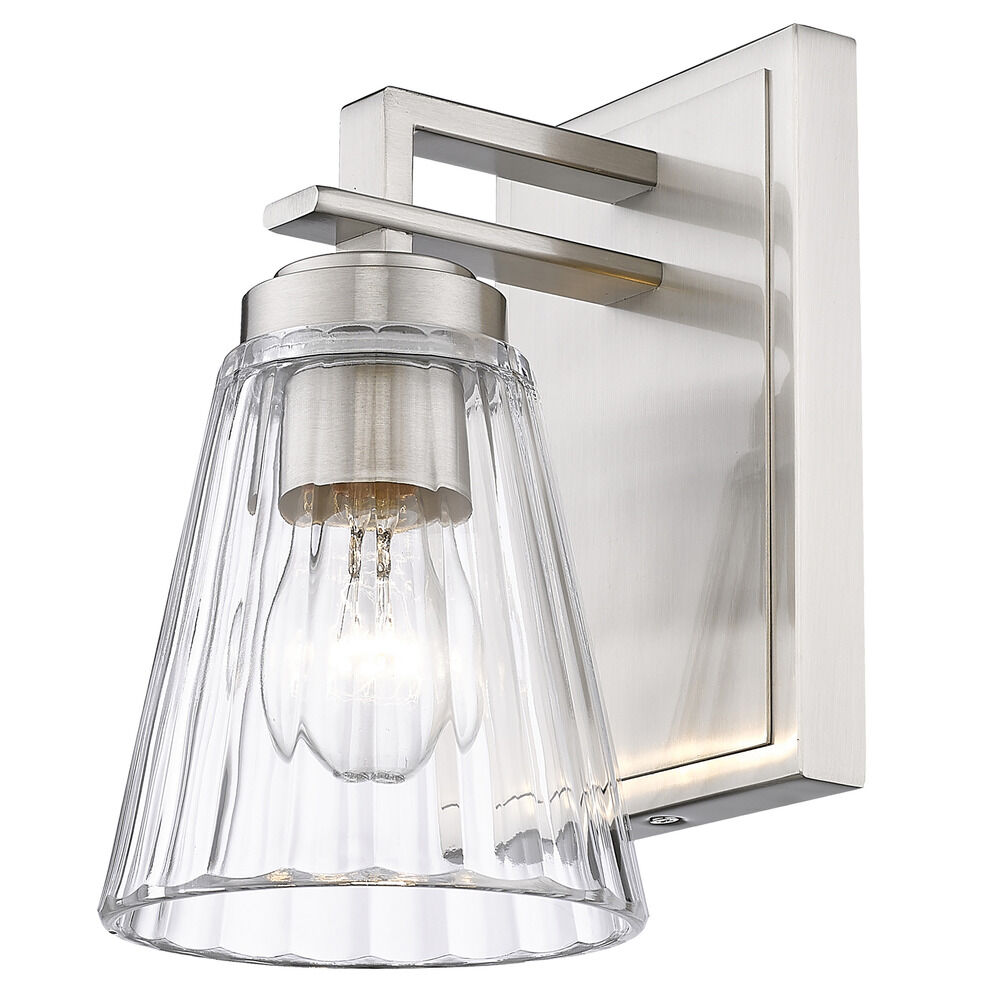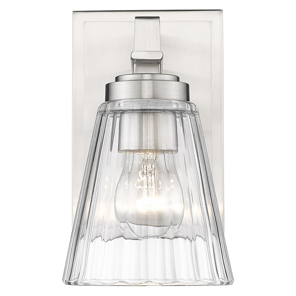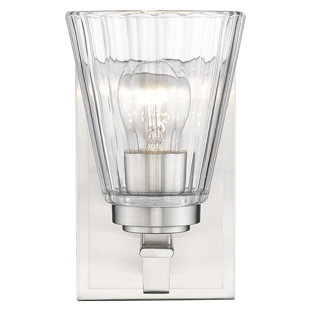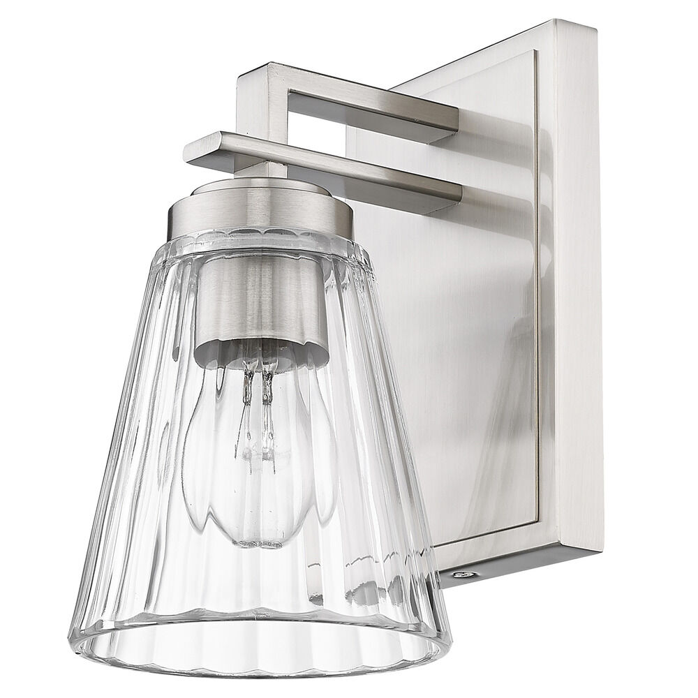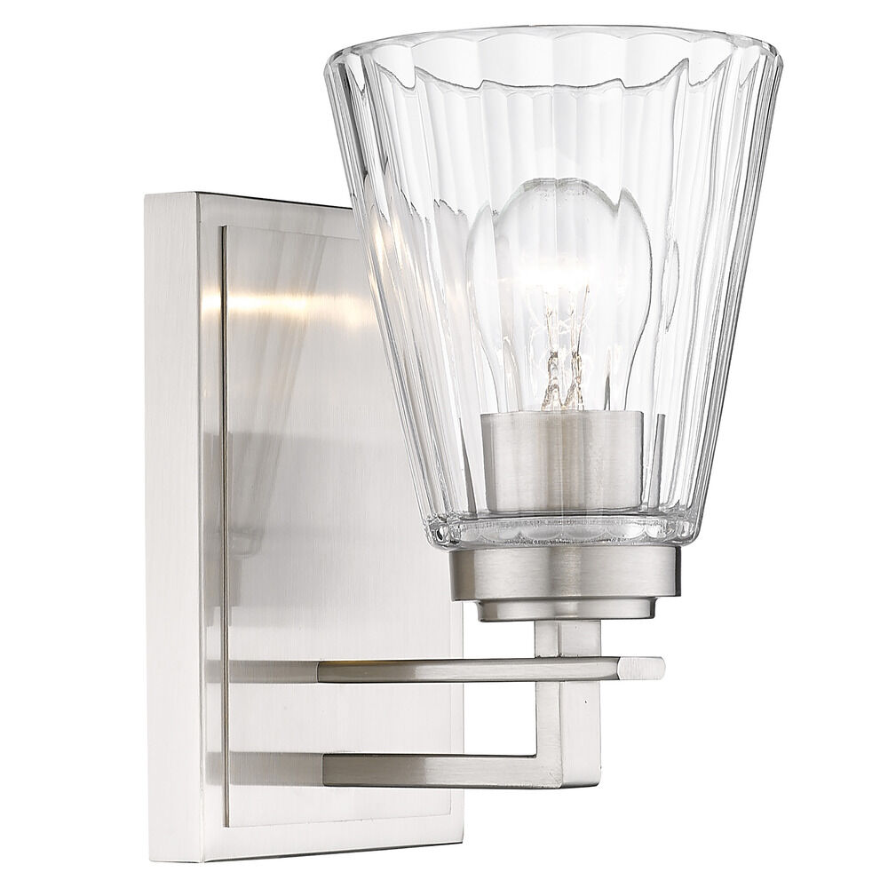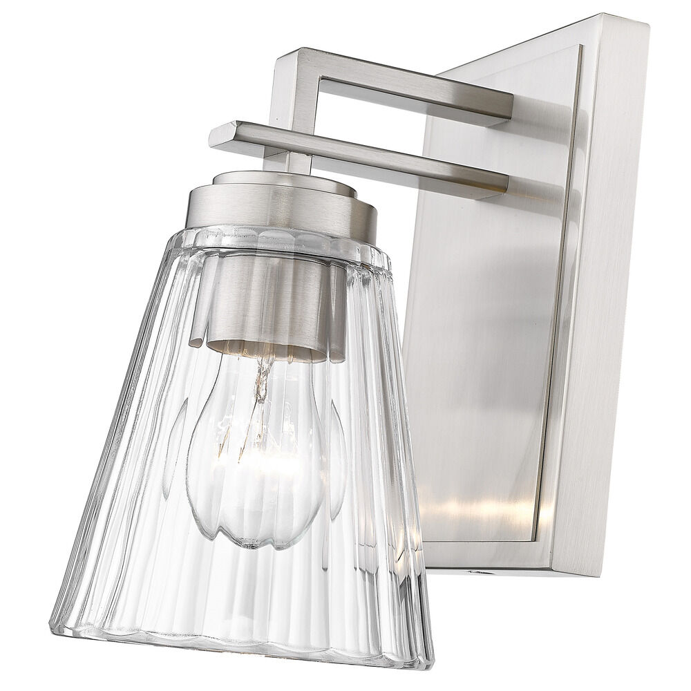 Contemporary / modern brushed nickel 1-light sconce with clear,ribbed clear glass shade
