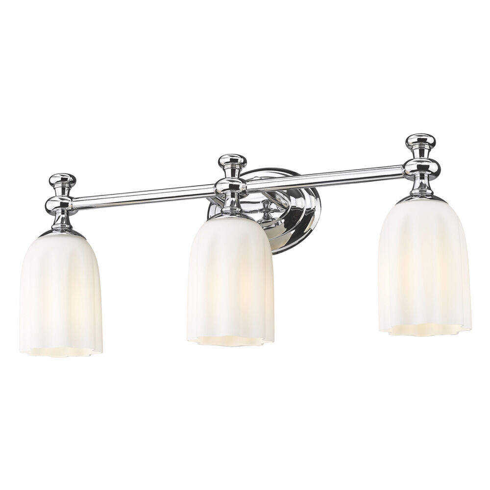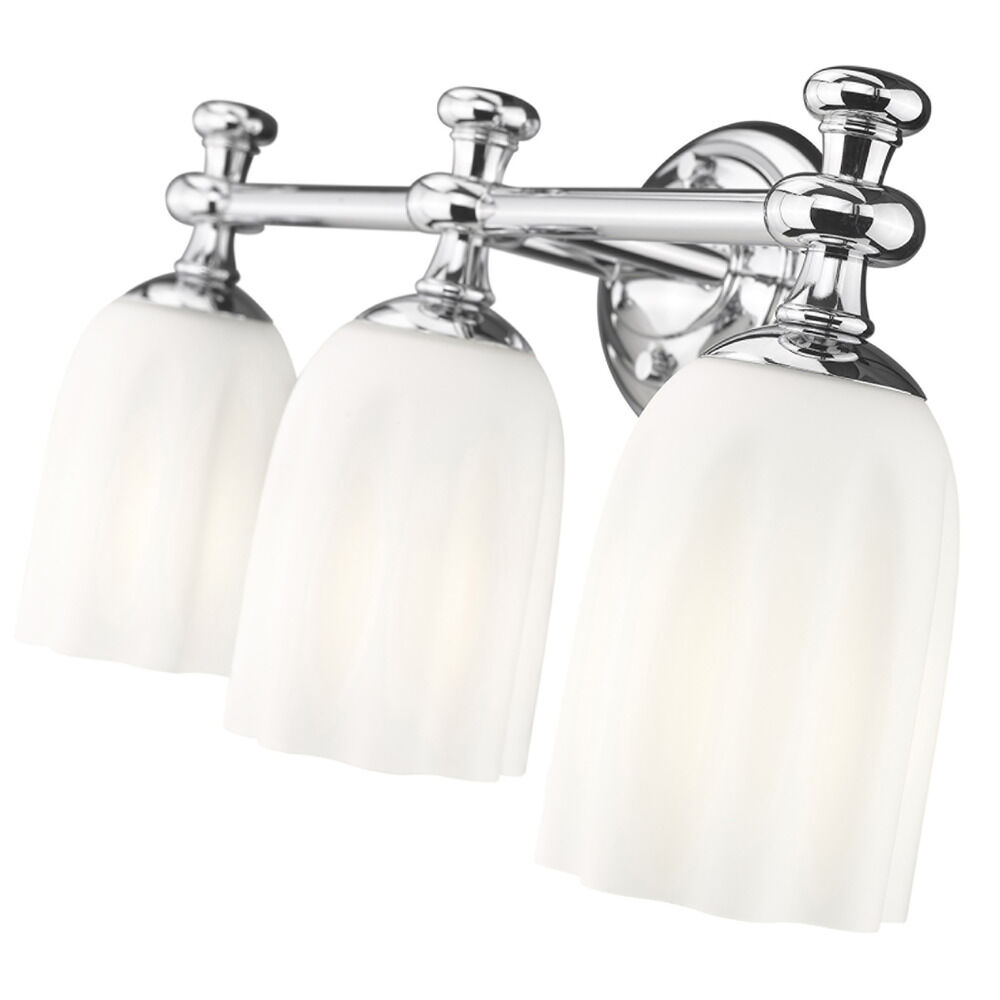 Transitional chrome 3-light bathroom light with etched,scalloped opal etched glass shade