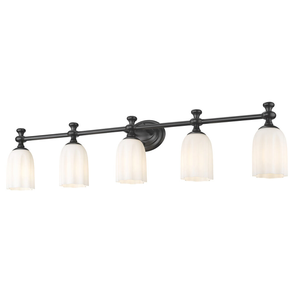 Transitional matte black 5-light bathroom light with etched,scalloped opal etched glass shade