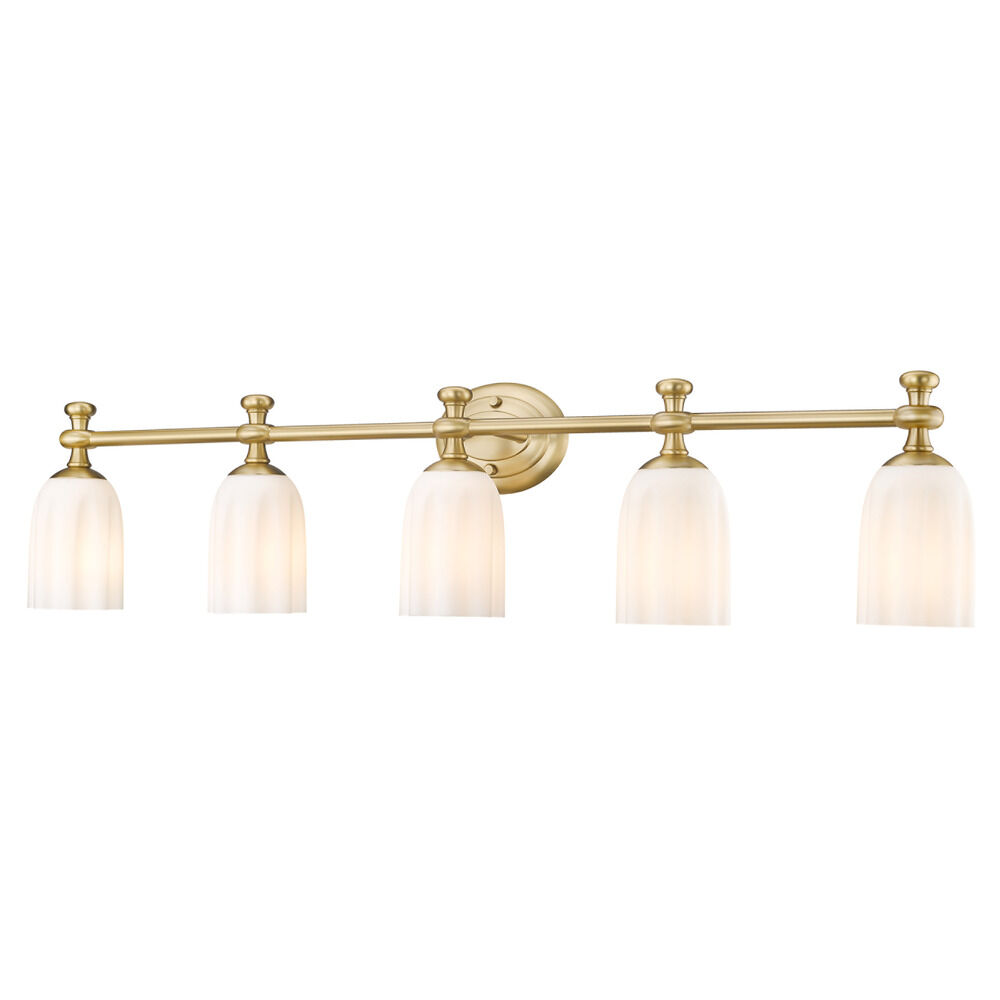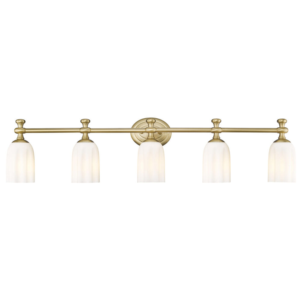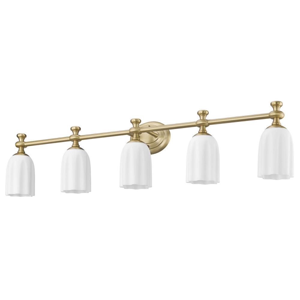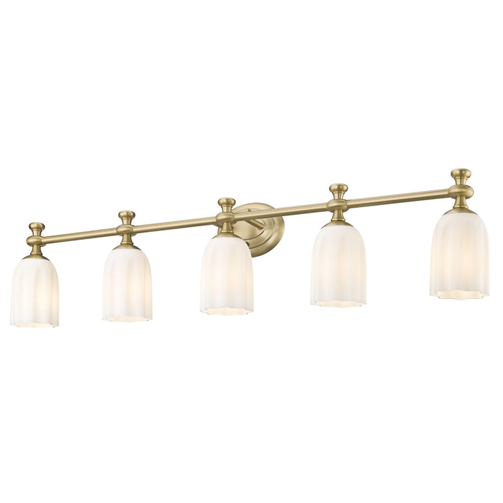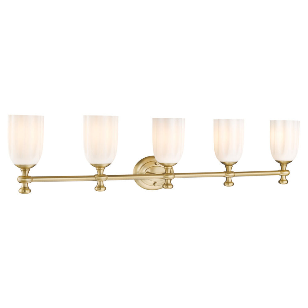 Transitional modern gold 5-light bathroom light with etched,scalloped opal etched glass shade